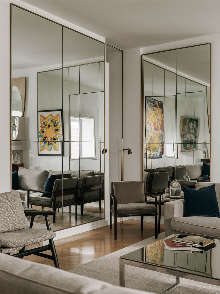 Big mirrors change the impression of space, making a living room look bigger and lighter. Choose mirrors with frames of different, bright colors and play with them so they become a colorful wall background for living rooms. Besides the practical use these mirrors play, their placement also has the added benefit of reflecting light and color, thereby aesthetically pleasing the room.