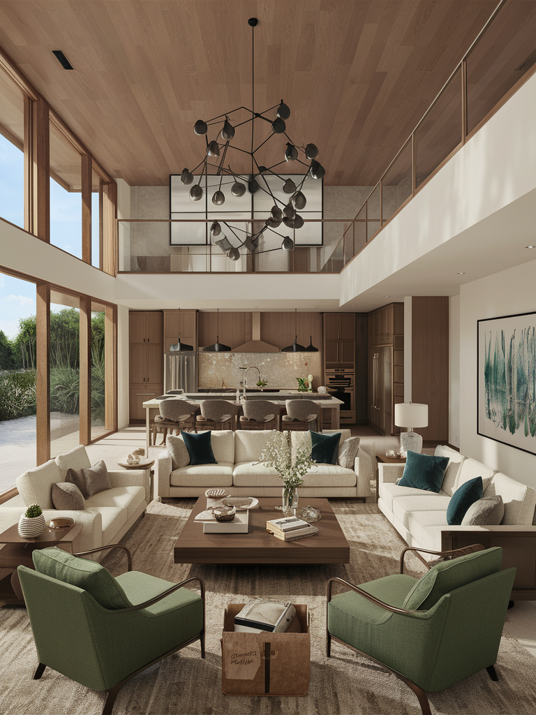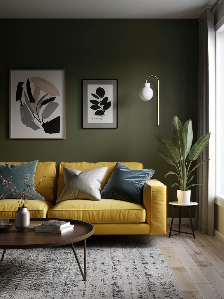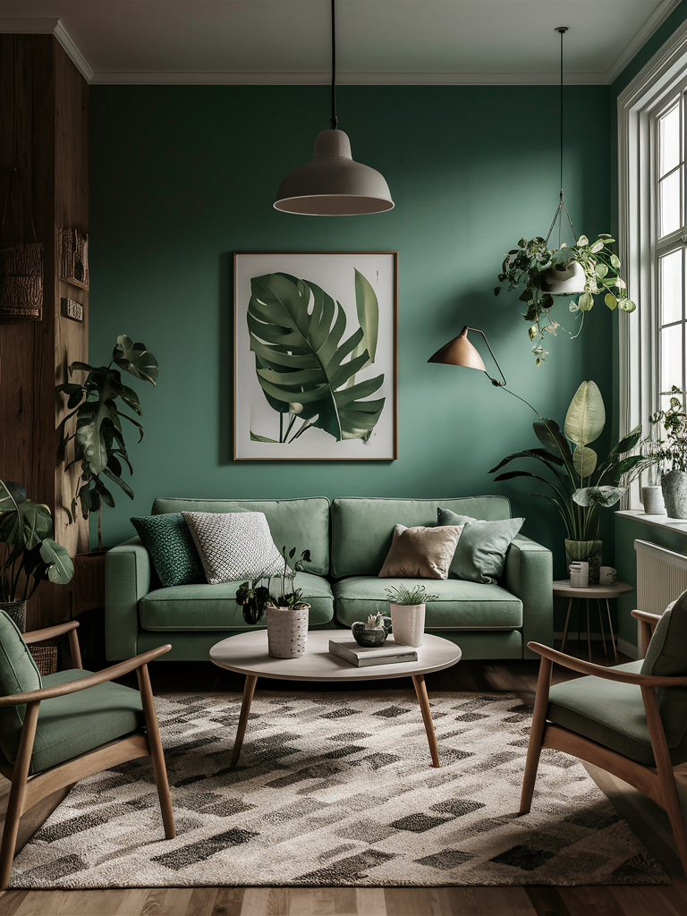 A green living room mimics the nature outside cities – pure love of nature. Green represents colors that might be bright and shimmering to dark olive or earthy hues, while they make for a revitalizing and cheerful atmosphere. Introduce green into the room through wall paint, furniture, or accessories if you want it to be lively yet at the same time cozy and comfortable. Appropriate blending of green with other elements of nature such as nature, probably wood and plants, gives the space an earthy touch.