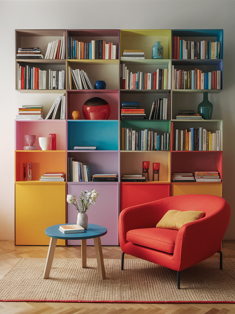 A color-coordinated shelving cabinet will keep the living room well-ordered and crispy. The mood in the room can be enhanced by grouping books, decorations, and personal items by color to make it aesthetically pleasing and coherent. This method besides giving the room a pop of color, also makes the room clean and trendy.