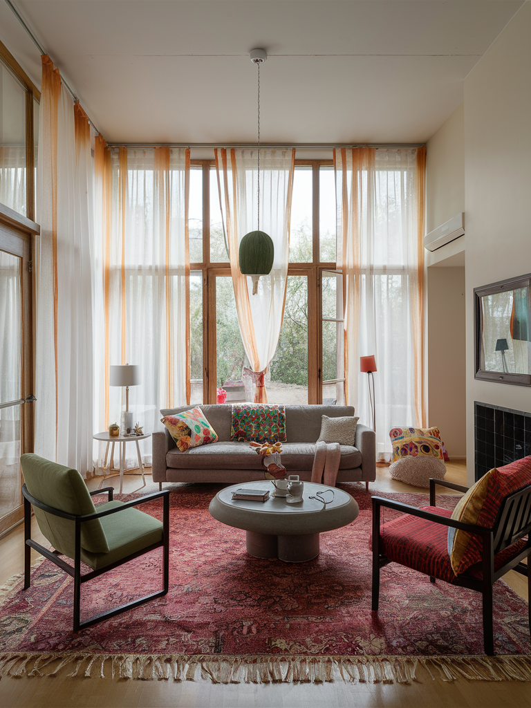 When a living room is umpteen-colored, the quality of the atmosphere presented in the room may vary due to the level of natural light. Large windows can not only transform the appearance but also make the colors more intense. Sheer curtains plus colorful decoration can be the princely catwalk for the sun. Sunlight is the spirit of colorful design when it shines through the colorful room and makes it. A colorful room, in turn, becomes more attractive and inviting from it.