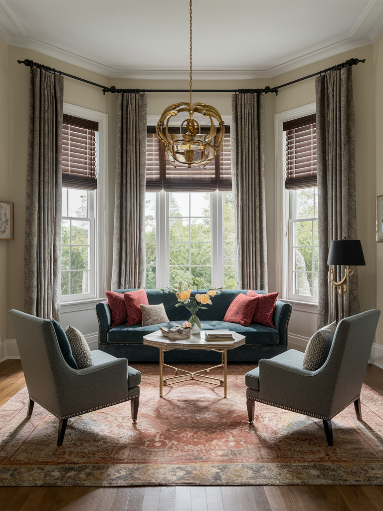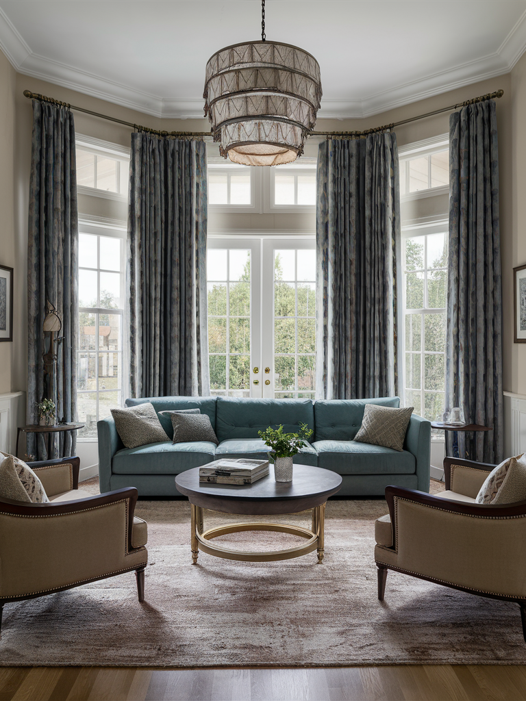 Stylish window curtains enhance the beauty of your living room providing much-needed privacy and sunlight control. You can use a combo of blinds, shades, and curtains in various materials and colors to look perfect your room’s decor. Sometimes inventive solutions such as combining both sheer and blackout curtains offer more stylistic choices, while for a bolder statement, sheers can be doubled with more dramatic patterns and colors.