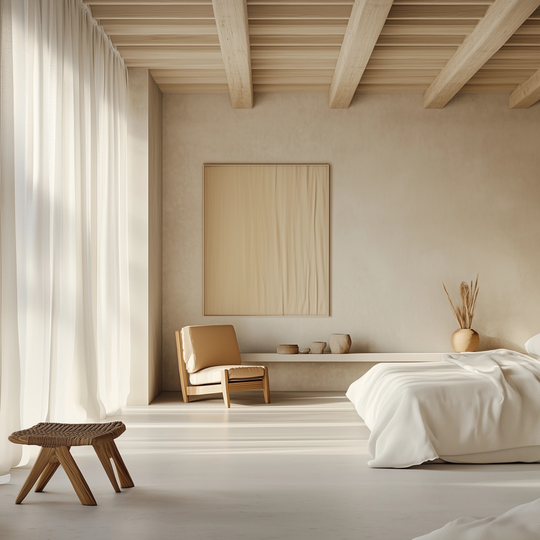 Those who long for a very modest, fresh image will find light-stained concrete floors perfect for their living space. What has actually happened here is that the concrete surface, instead of being plain, has been decorated with a small amount of a pale yellow color and as a result, it has a soft, earthy appearance. Painted wood ceilings and walls, sliding doors, and open areas are just some of the decors that fully used the neutral base to create a harmonious interior.