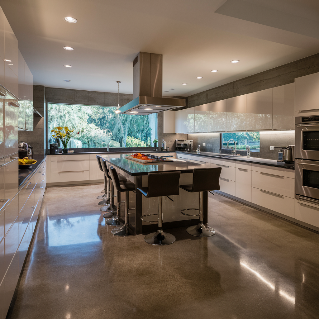 Doing the kitchen floor with concrete is a really great idea and it turns it into a stylish and practical part of your residence. They are super durable, spill and stain-resistant, and very easy to clean which are characteristics needed in a high-traffic room like the kitchen. Furthermore, the use of concrete floors can be mixed and matched with a wide range of cabinetry and countertop materials thus making it a highly flexible choice.