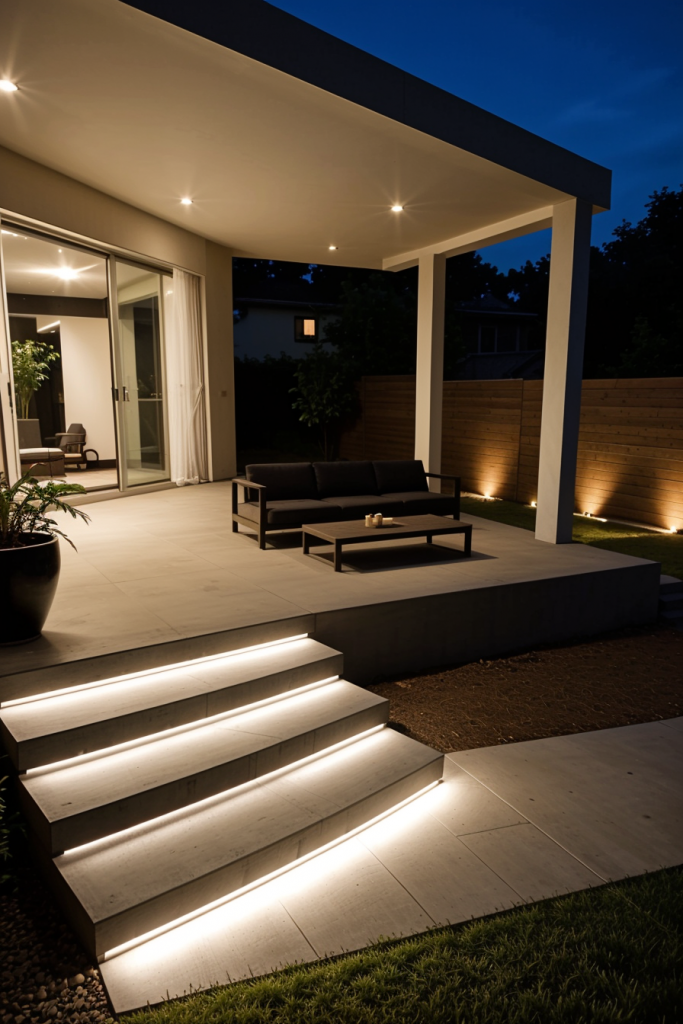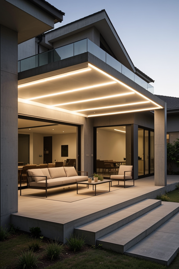 The use of integrated porch lights with concrete porches makes the ambiance more welcoming, especially at night. Embedded LED strips in steps and pathways as well as within the concrete flooring give the area a modern glowing outline. For a complete contemporary appearance, combine with modern outdoor seats and tables.