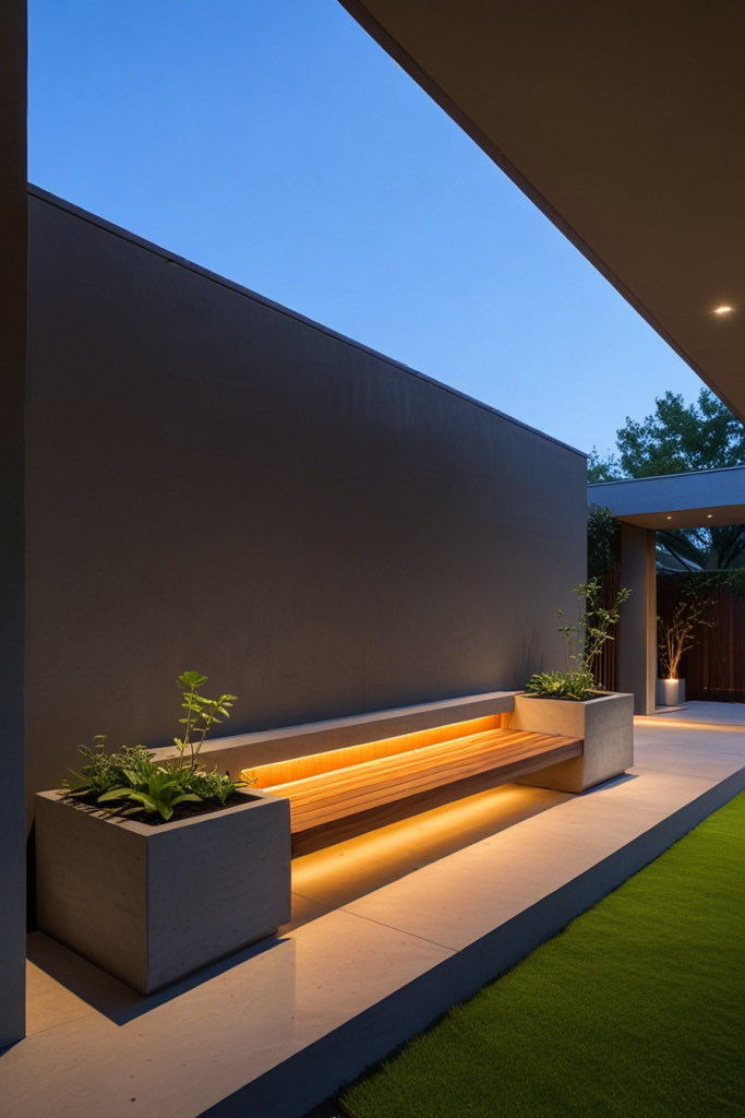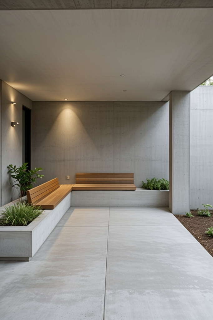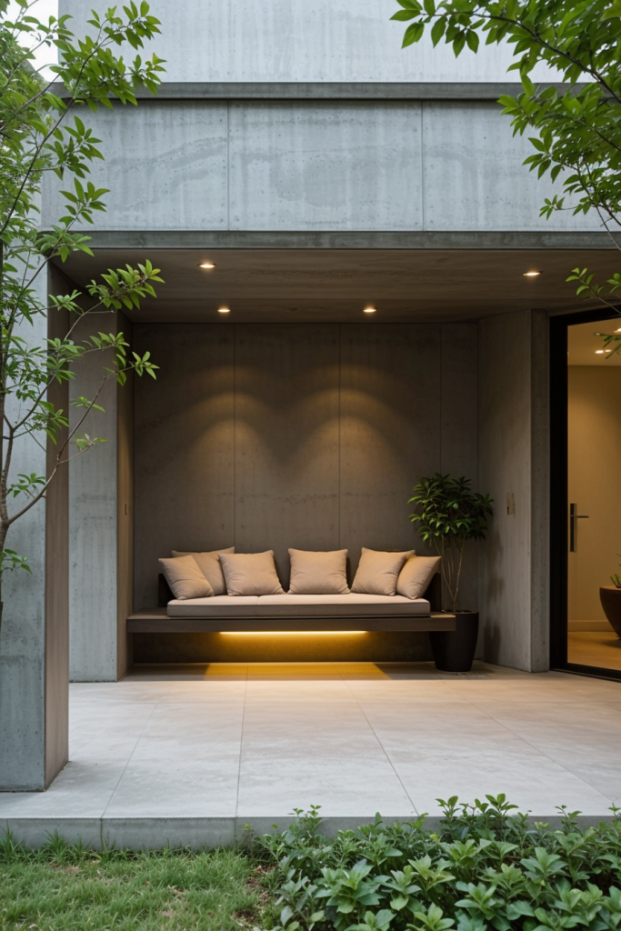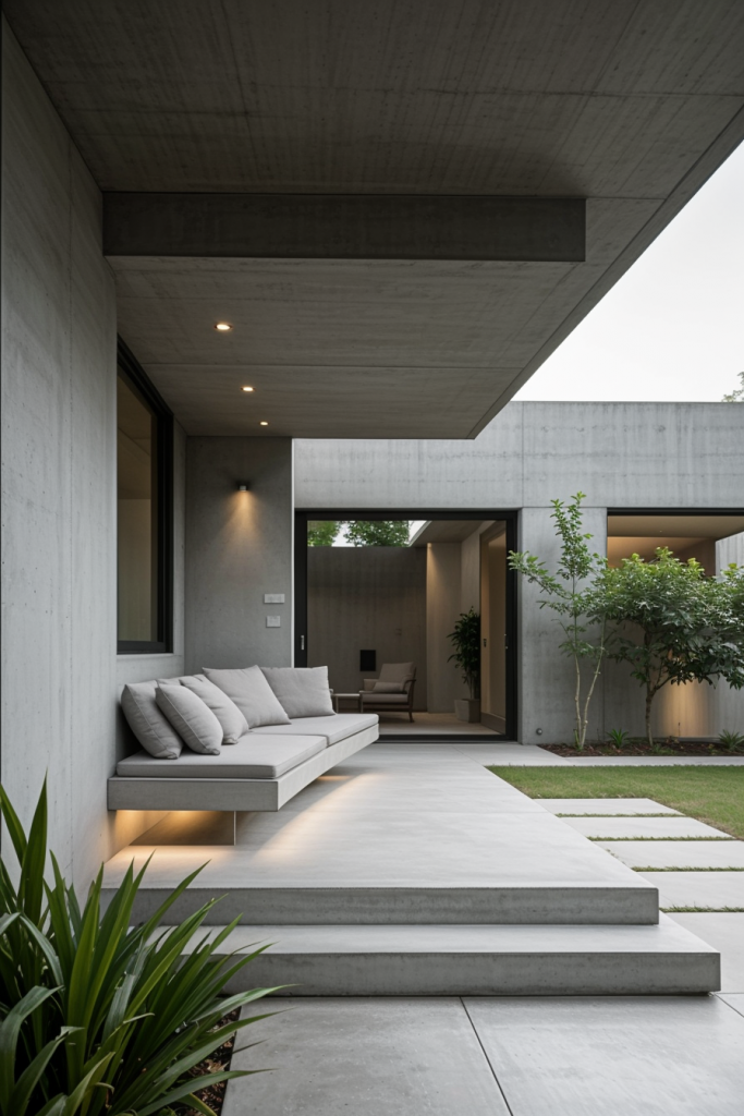 A concrete porch incorporates a built-in floating bench that serves as functional seating while blending harmoniously with the structure’s design. This approach works for all small and large spaces, especially when combined with integrated planters, soft LED lights, and cushions that are resistant to outdoor weather.