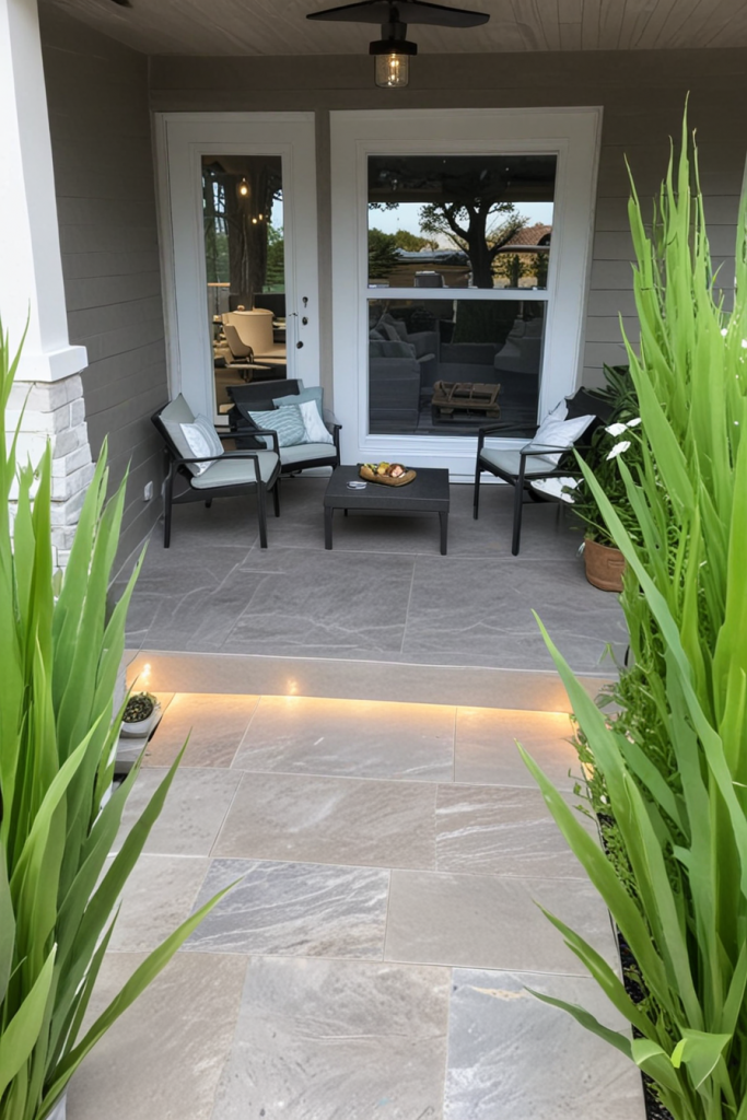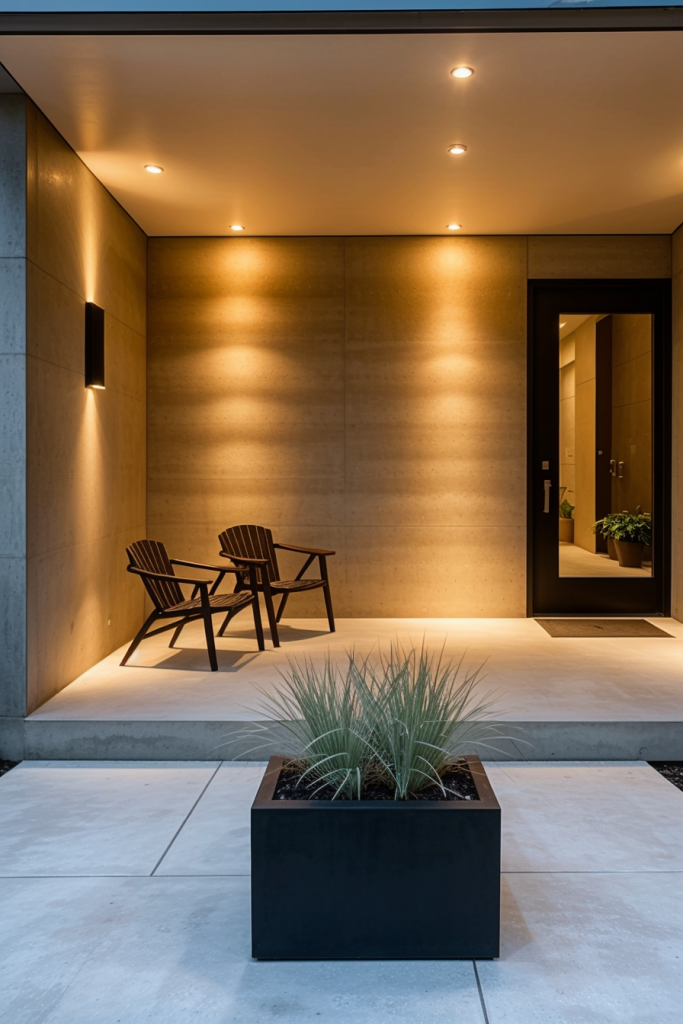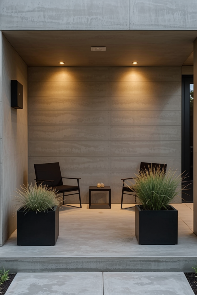 An accent wall with a 3D texture can turn a sleek concrete porch into a work of art. Choose sculptural motifs, geometric designs, or embossed concrete panels for variety and depth. Subtle lighting that accentuates the texture’s depth works really well with this feature. Achieve a refined, elegant look by combining it with minimalist planters containing ornamental grasses, and furniture pieces, which create balance with the texture.