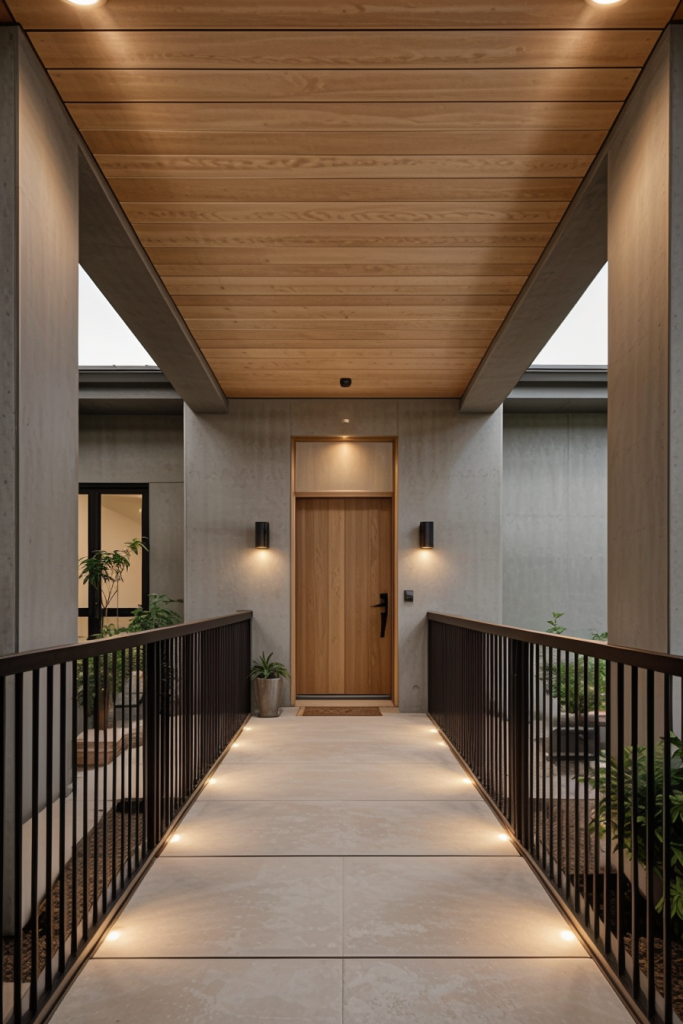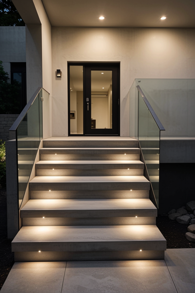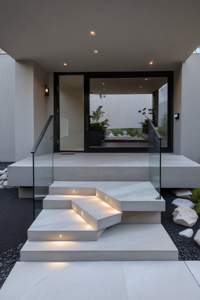 The centerpiece of the entrance is a floating staircase that flows right into a modern concrete porch. This design often includes wide, cantilevered concrete steps, integrated lighting to showcase the architectural beauty, and an open riser design. The sophisticated charm is enhanced by a frameless glass railing or metal handrails.