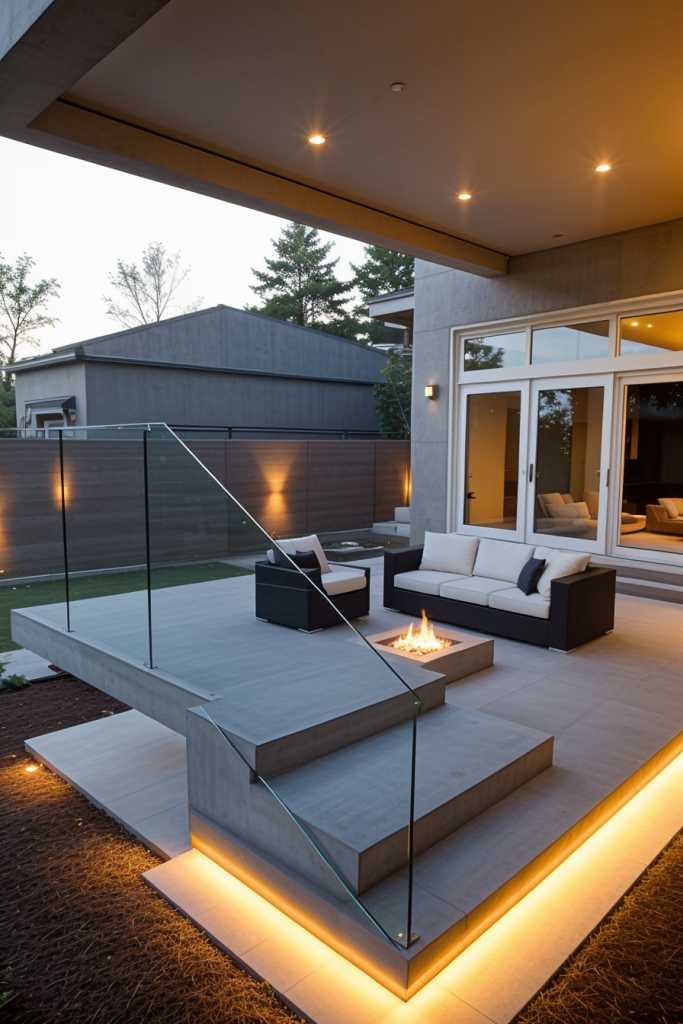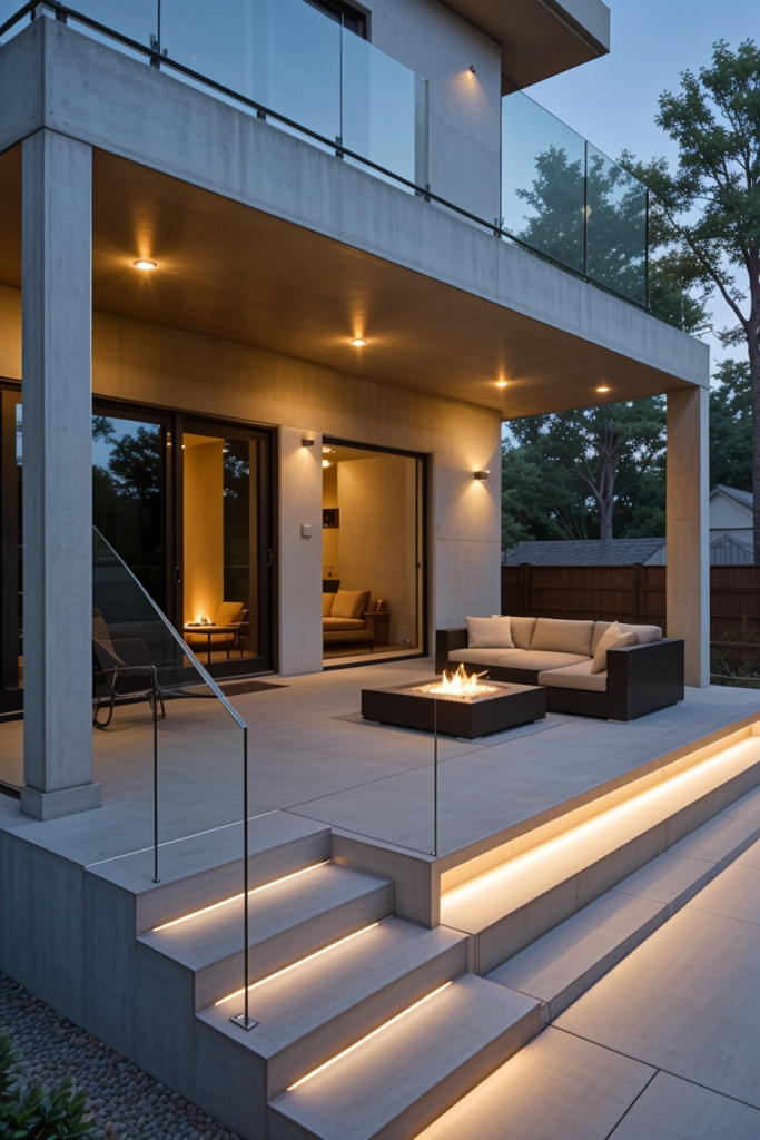 An elegant modern concrete porch is further accentuated by the installation of a frameless glass railing which provides an unobstructed view and safety. These details work beautifully with floating stairs, a subtle concrete floor, and hidden LED lights along the perimeter. To enhance the beauty of the space, accessorize with a contemporary low-section fire bowl and a sofa.