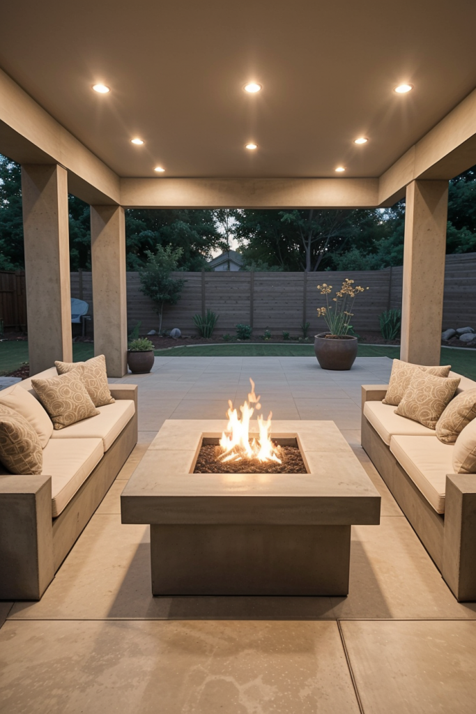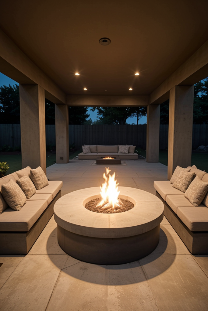 Contemporary Concrete Porch with a Sunken Fire Pit