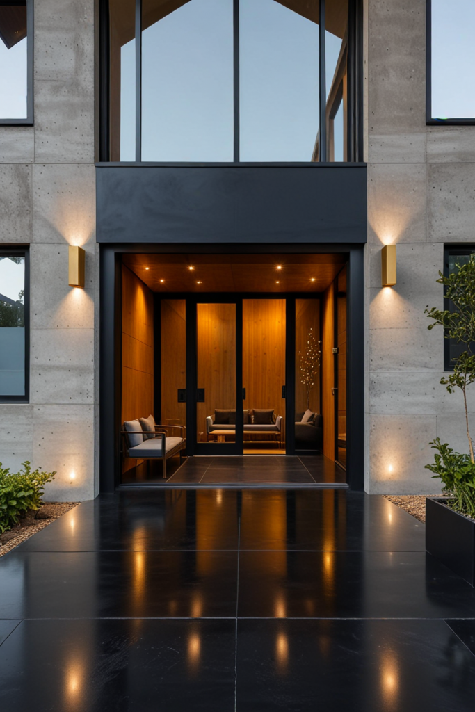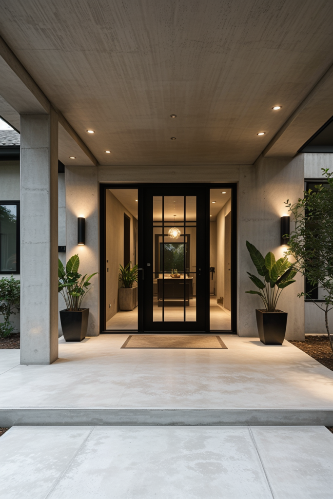 Concrete Porch with a High-End Metal and Glass Entry Door