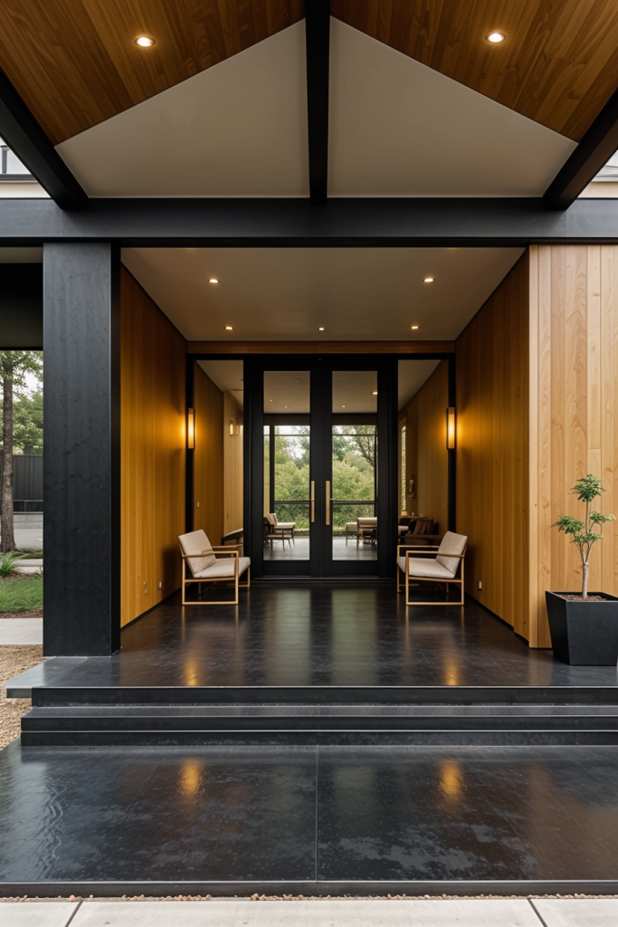 A modern porch in dark charcoal or black concrete makes an impressive statement. This color works wonderfully with warm wood paneling, gold accent fittings, and expansive glass windows. Additionally, the high gloss of the black concrete porch captures natural daylight which adds to the already stunning beauty of the porch.