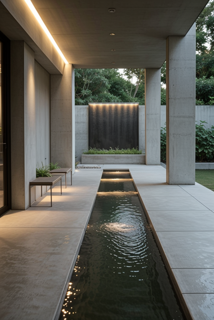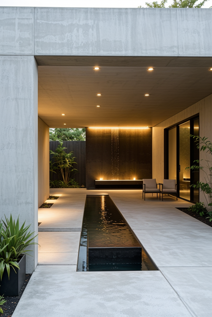 Adding a water element to a concrete porch increases its tranquility and sophistication. The calming subtlety is achieved by modern aesthetics, enhanced by a linear waterfall wall, sleek reflecting pool, and a water channel. To achieve a contemporary feel, combine with soft landscape lighting and textured walls.