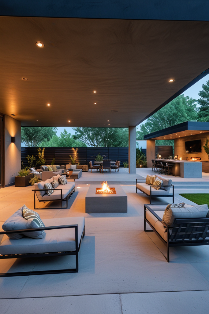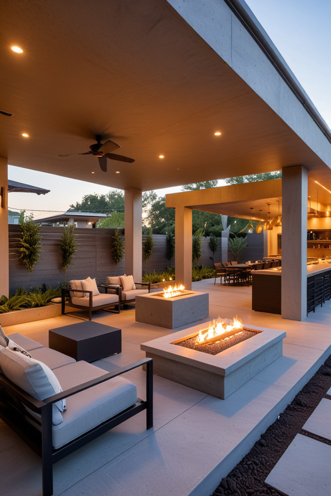 A spacious open styled concrete deck serves as excellent meeting space accommodating both outdoor and indoor activities. The design usually comes with integrate concrete slab, various sitting arrangements, and particular roofed spots for protection against the sun. Incorporate an outdoor kitchen or bar, modern sectional seating along with a fire pit to amp up the space’s comfort and design.