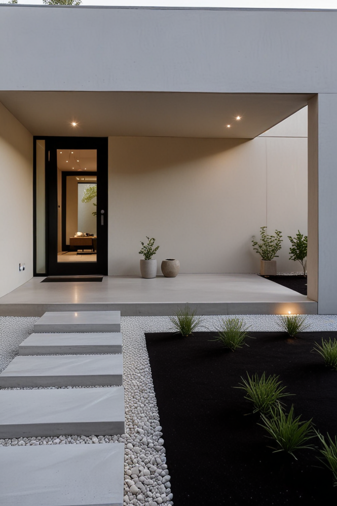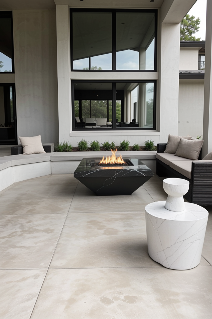 By using a mix of matte, polished, dark, light, smooth, and rough concrete finishes, a multi-tonal concrete porch achieves a layered and dynamic visual effect. This modern approach remains balanced by the sophisticated curated look. The design is easily completed with a cohesive black, gray, and beige color scheme.