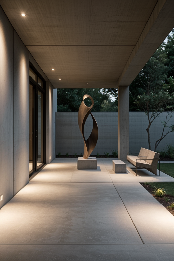 Integrating a statement sculpture or art piece onto a concrete porch not only adds sophistication but also serves as a distinct focal point. Modern abstract sculptures, sleek metal installations, or minimalist stone figures all enhance the architectural integrity of the porch. The artwork is better showcased with subtle lightings as well as a neutral color palette.