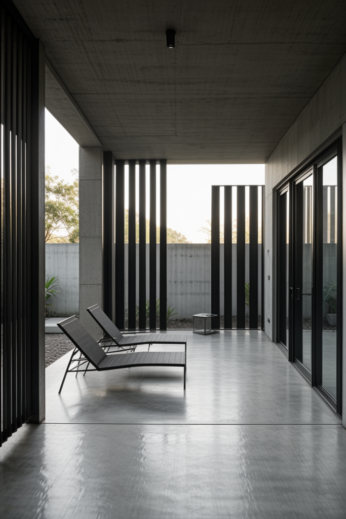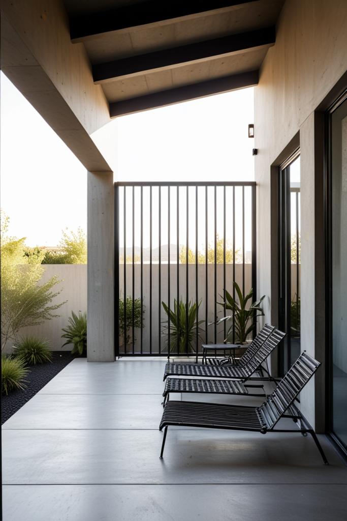 Vertical slatted privacy screens offer an attractive and functional feature on a concrete porch while providing shade, privacy, and depth to the architecture. These screens can be made out of wood, metal, or composite, and serve as a barrier that is only partially opaque. This design, coupled with minimalist furniture and a smooth concrete surface, brings sophisticated orderliness to the area.