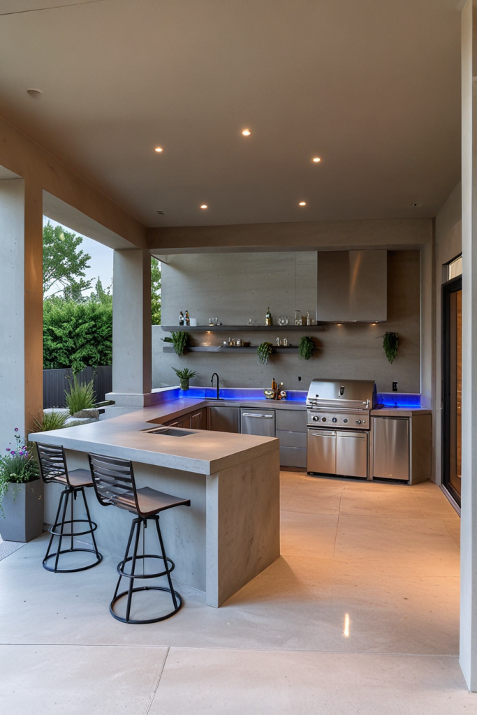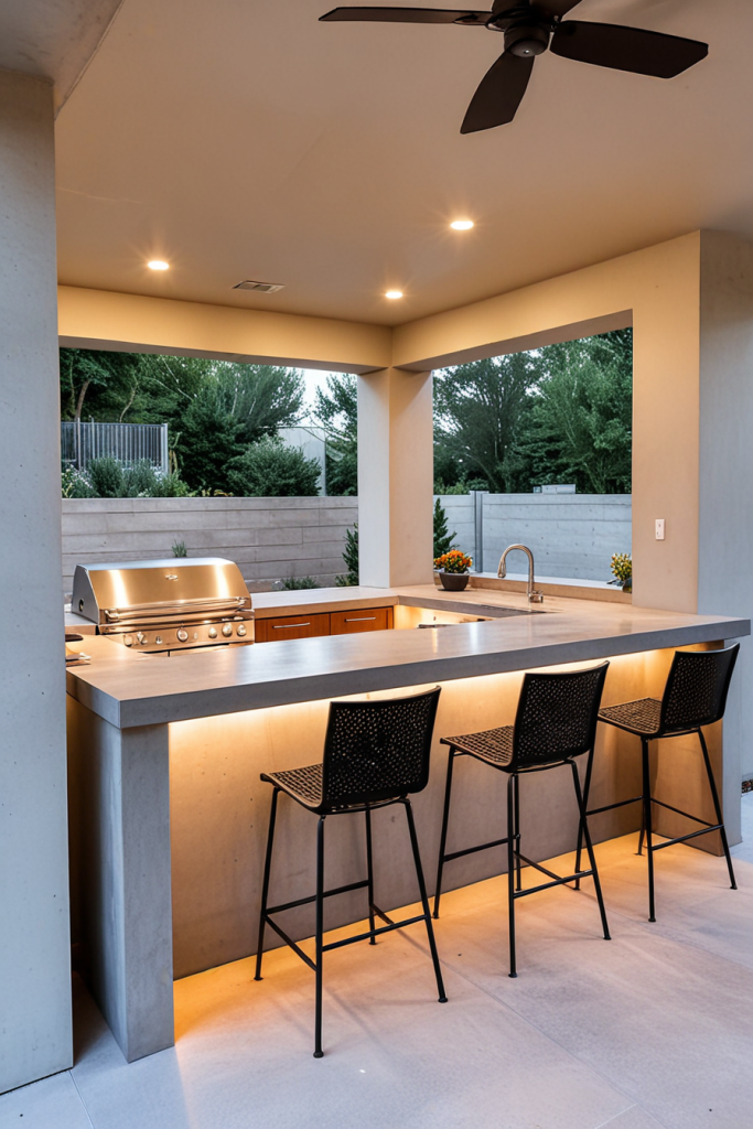 Transforming a concrete deck into a lively perch for entertainment is made easy with an outdoor kitchen or bar. The modern design is further enhanced with an integrated storage space, bar stools, and a built in concrete counter that features a sleek grill station. Include stainless steel appliances, a waterfall-style countertop, and ambient light fixtures to achieve a modern look.