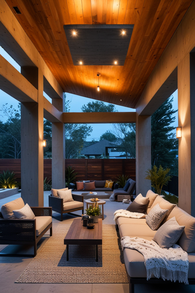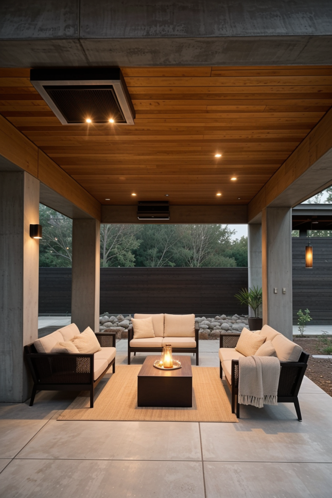 Our open-air concrete porch is equipped with ceiling-mounted heaters for warmth and coziness no matter what season it is. The heaters are built into a floating ceiling/pergola so the aesthetic can be minimalistic. For a relaxed ambiance, use modern lounge furniture, soft throw blankets, and a fire pit.