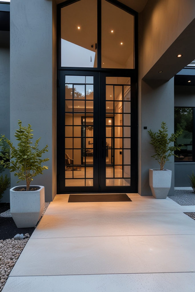A luxurious glass and metal front door becomes the centerpiece of the house’s facade while simultaneously upgrading the concrete porch. Consider pivot-style doors with black framed glass panels or steel detailing to match the modern style of the porch. The juxtaposition of thick concrete and glass gives dimension, and the new age feel is further enhanced by the warm lights and simple decorations.