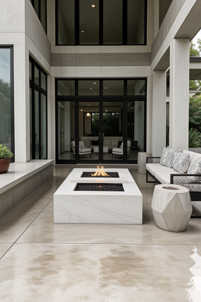 An outdoor space incorporated with ultra-modern features is accentuated by a sunken fire pit that is integrated into a concrete porch. This design has an often built-out concrete bench seat with cushioning provided for maximum comfort, seated area sunk into the ground. For an added touch of class, the gas fire pit can be used which along with sleek and polished surrounding flooring gives off a clean look.