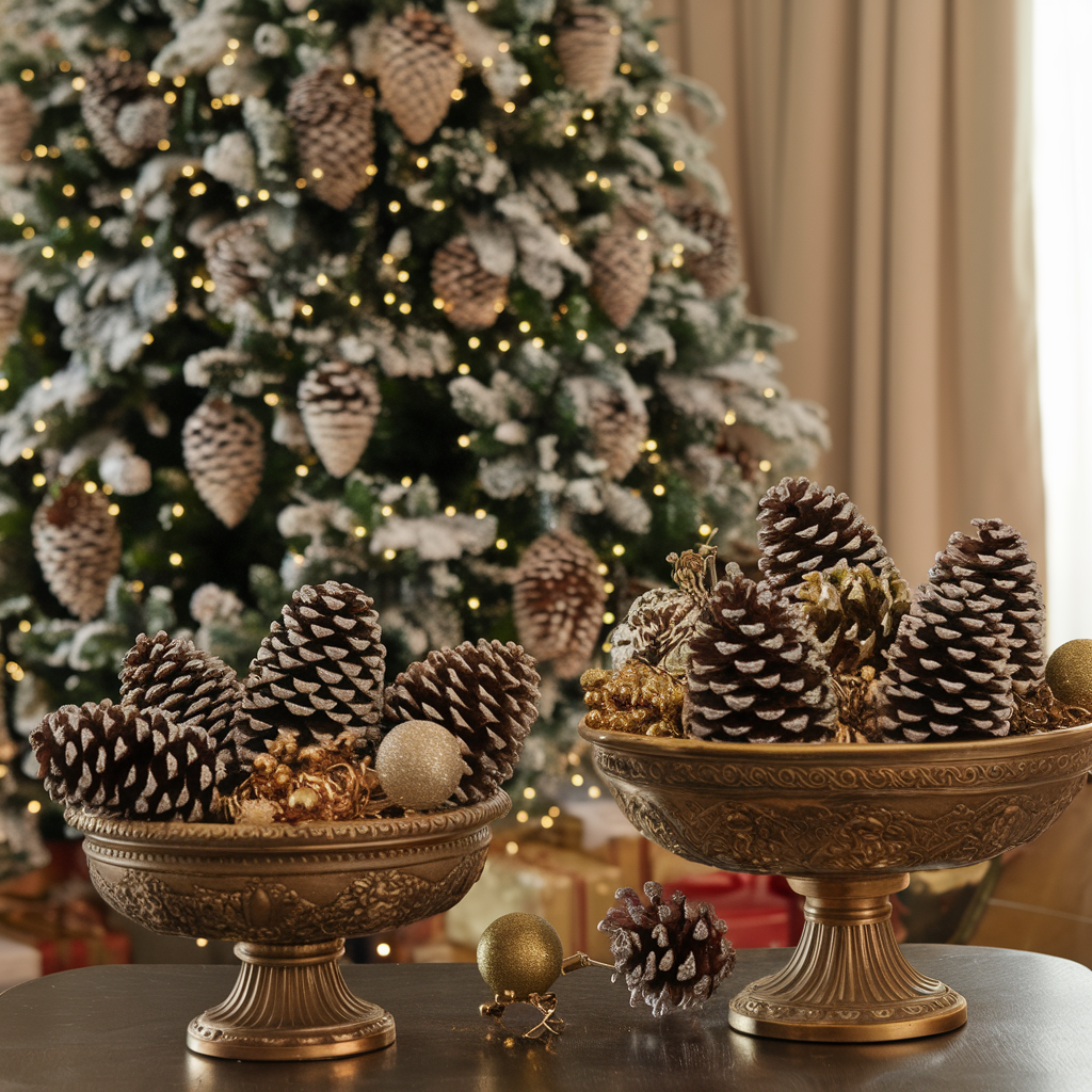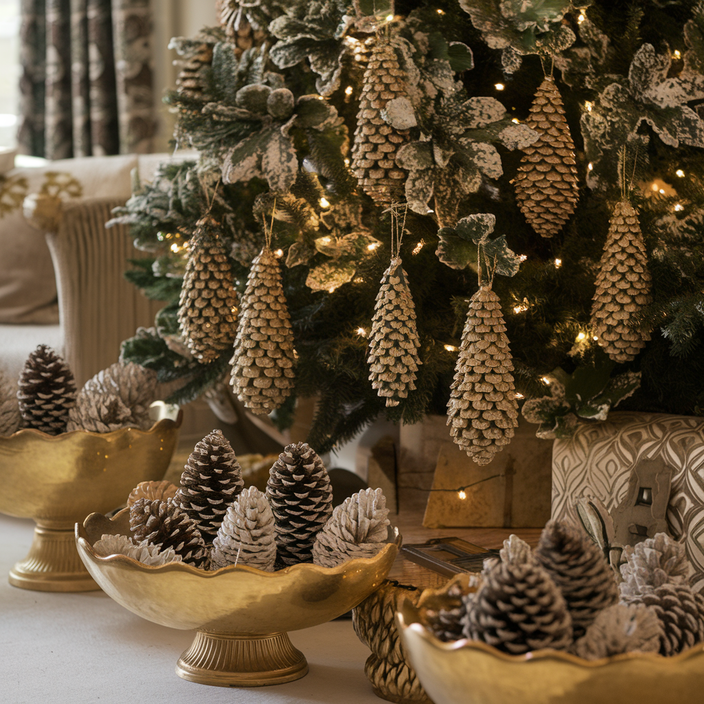 Gilded Christmas tree cones act as a stylish addition to your living room décor. These cones can be hung on the tree, placed in bowls on the tables, or even arranged on the mantel. Their golden hue is the thing that links the whole cozy setting together by giving a touch of luxury and warmth. They look best when used with other golden accents, such as candle holders or ribbons, to make an elaborate design.