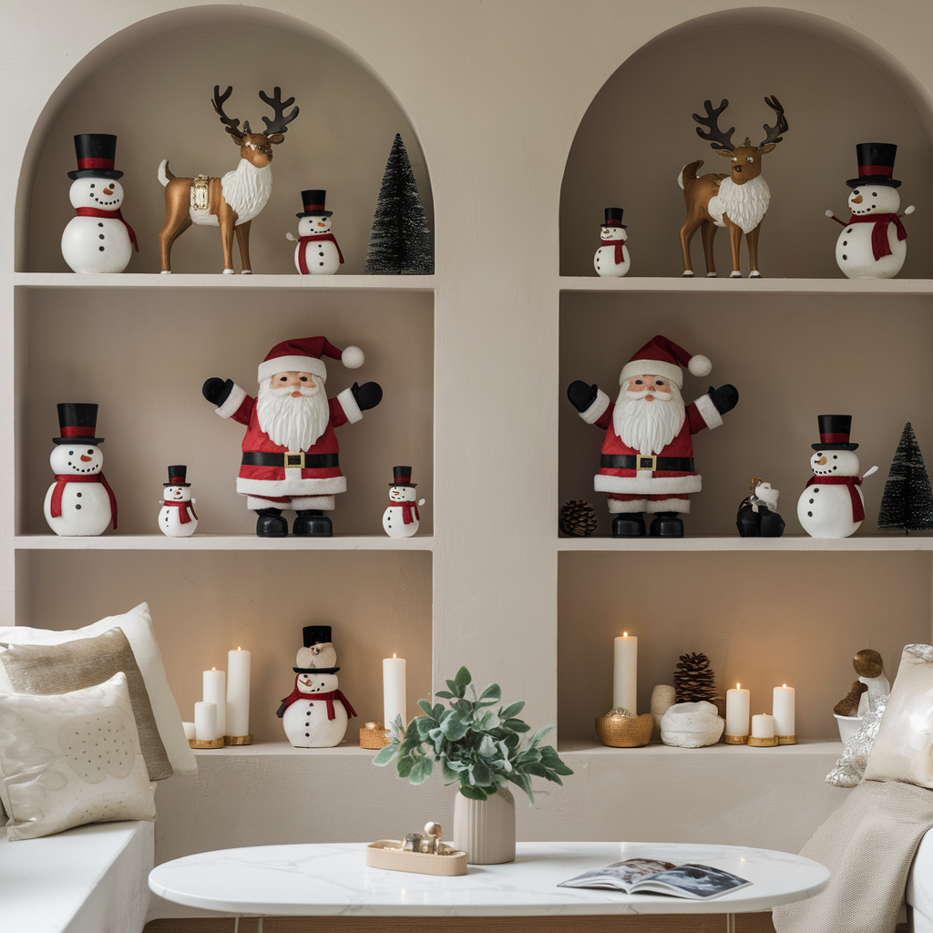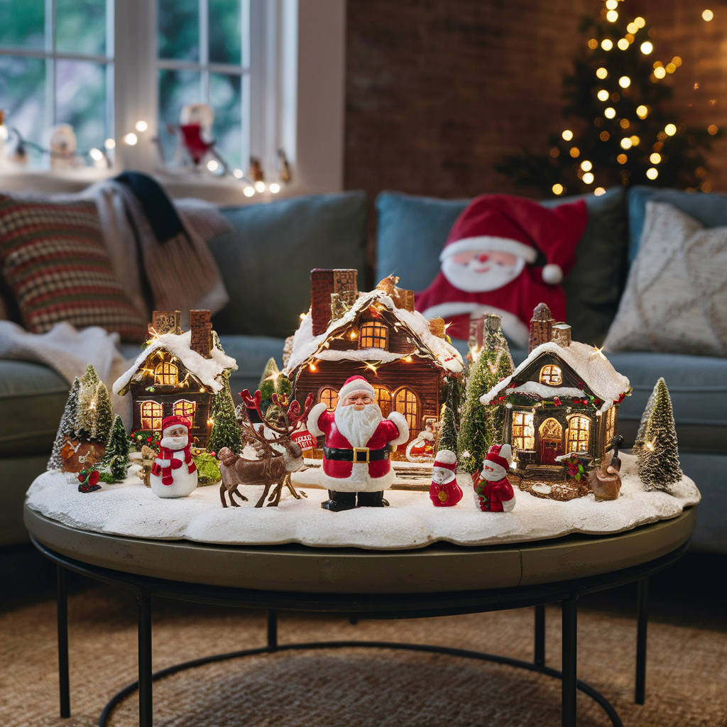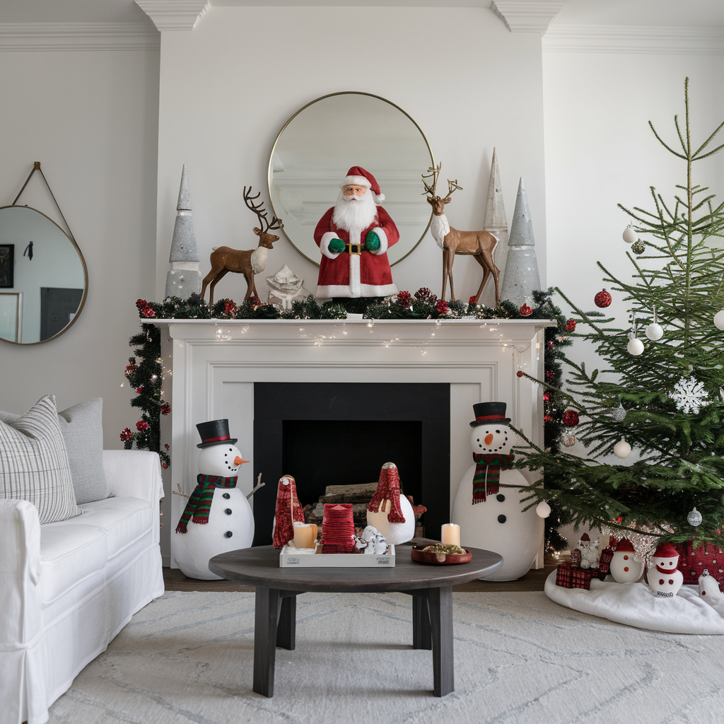 Figures of Santa Claus, Reindeer, Snowmen in the Living Room