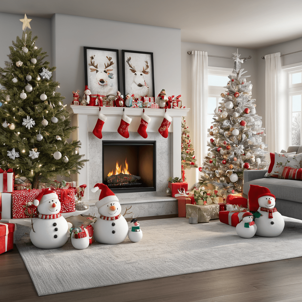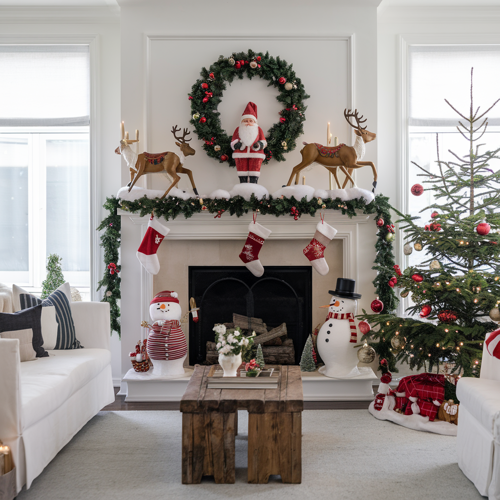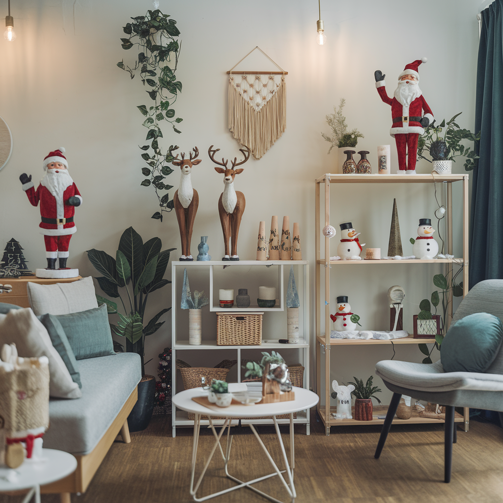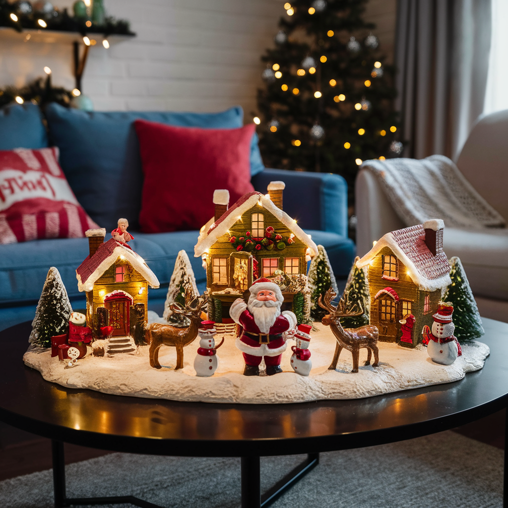 Figures of Santa Claus, Reindeer, Snowmen in the Living Room