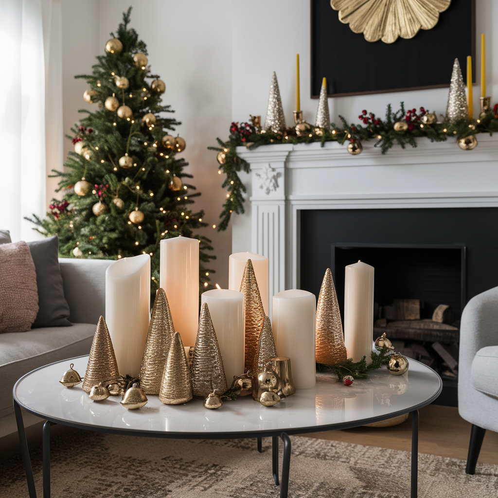 Christmas candles are a simple but very effective way to make a warm ambiance in the room. Stack up tall, thin candles with shorter bras-shaped ones along your fireplace, coffee table or even windowsills. Aromatic tapers of mild festive scents such as a pine or vanilla which you can use to create the warmth of the season. To establish a more minimalist and classy look, blend the gold-rounded candles and silver mini Christmas bells. The tender shimmers of the candles will infuse your living room with a dreamy sensation, making it cozy, yet it gives a welcoming environment.