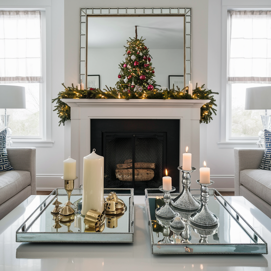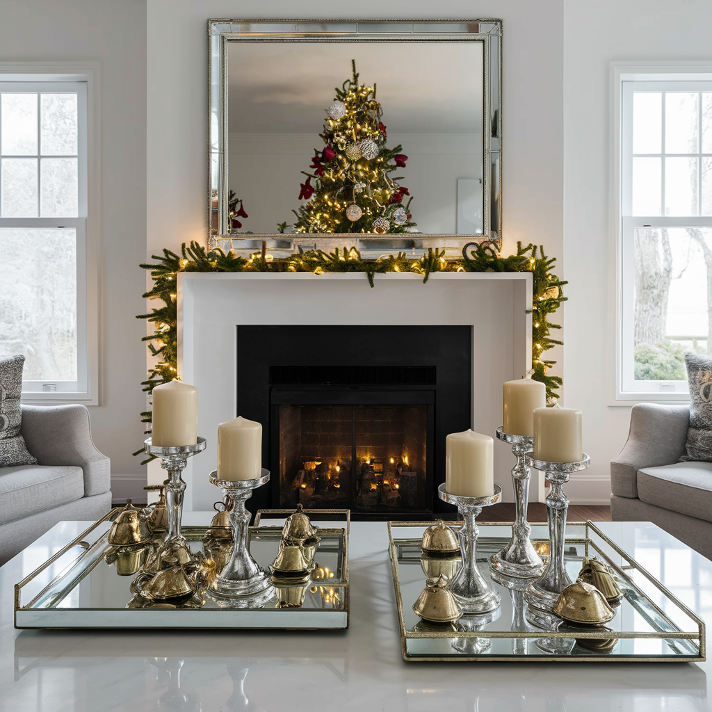The use of mirrors and reflective surfaces on Christmas can enhance the living room with a festive mood. A large mirror above the mantel or a Christmas tree in the background will make the space feel alive by doubling the lights and decorations that are reflected in the mirror. You can use mirrored trays to show off candles, Christmas bells, and other small decorations. Reflections are not only the main outstanding ingredient for your holiday room’s atmosphere but also they bring the elegance and sophistication that make your setup enchanted.