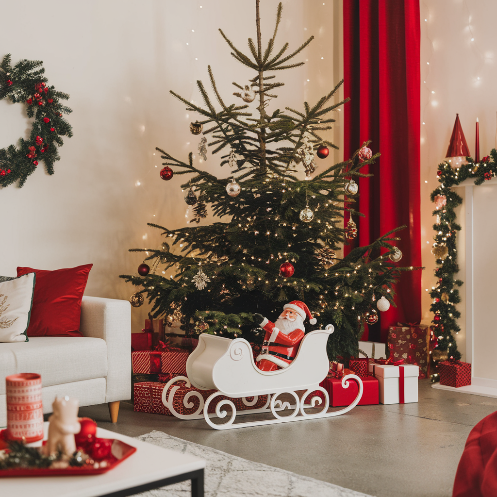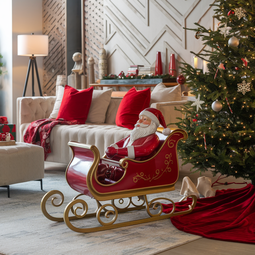 Integrating Santa Claus into your living room decor can instill a cheerful and playful mood in the room. A modern sculpture of Santa on a sleigh can be placed on a side table or under the tree, thus transforming it into the centerpiece of your holiday decorations. Coordinate this with the three red elements like a cushion and a throw so your theme will be unified. This hint of playfulness will enchant both kids and adults, making your living room a jubilant oasis.