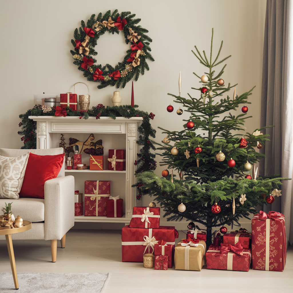 The intricately wrapped Christmas gifts can be used as decor elements in your living room. Place them below the tree or on a shelf so that people can appreciate them. Use red and gold wrapping paper that matches the color scheme of your living room and complete the look with ribbons, bows, and gift tags. This methodical placement not only contributes to the visual attraction but also raises the enthusiasm for the holiday.