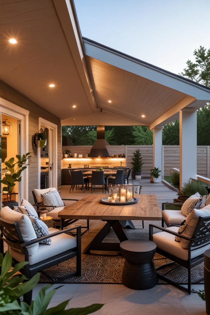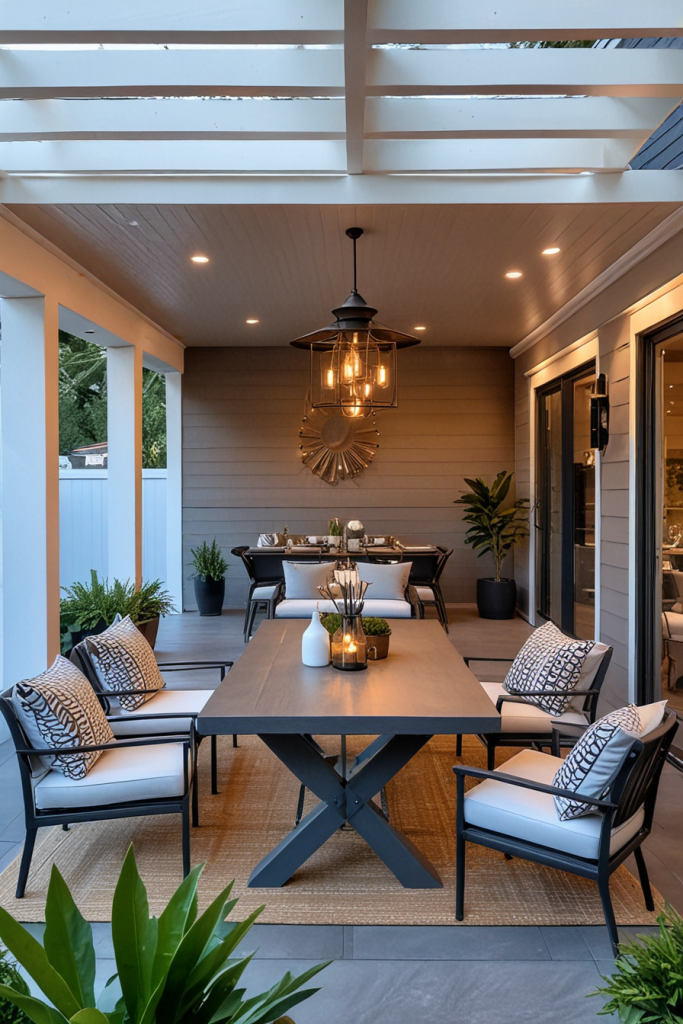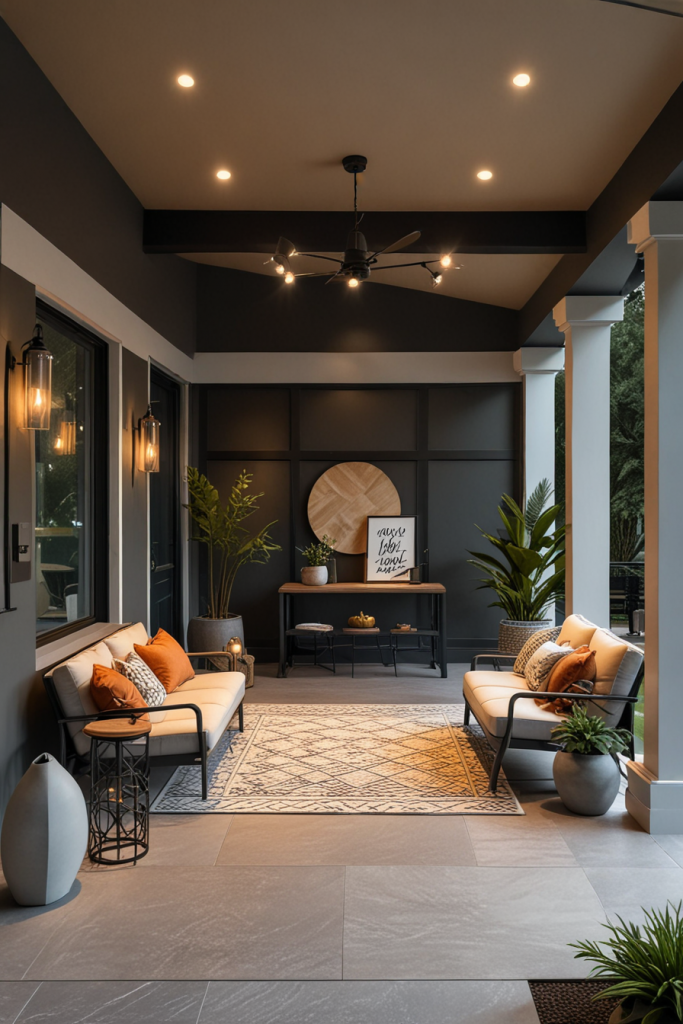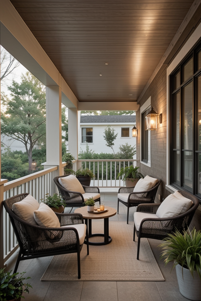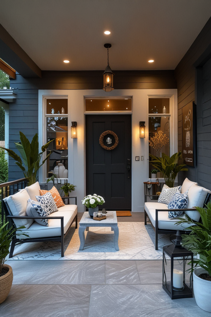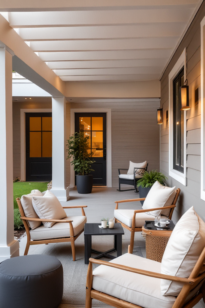 Your porch begins its welcoming charm of outdoor beauty with relaxing seating arrangements. Add some stylish and practical elements to the design with comfy chairs, nice cushions, and even recliners by the door to improve the overall aesthetic. The design creates a calm relaxed style as well as preserves the modern look which caters to both peaceful afternoons or busy get-togethers.