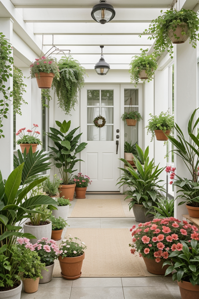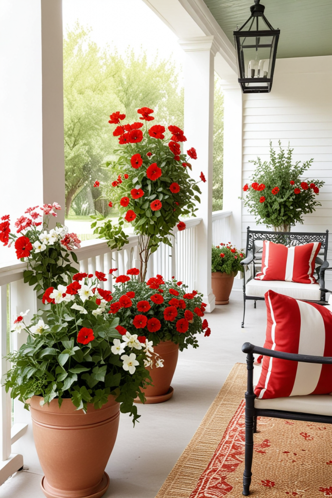 The design brightens up the porch with colorful flowers in pots which celebrate nature while serving as a central decorative element. The arrangements add color to compliment various styles like red and white decor, and olive and white decor themes. Small notes accompany seasonal changes and lively, natural elements that enhance the space.