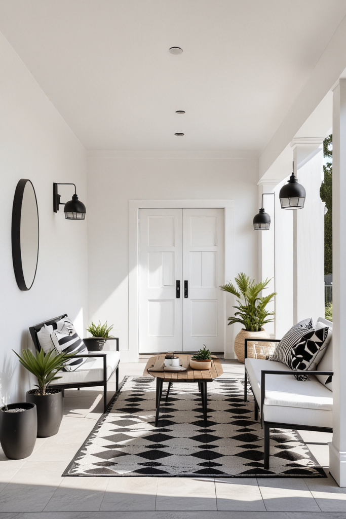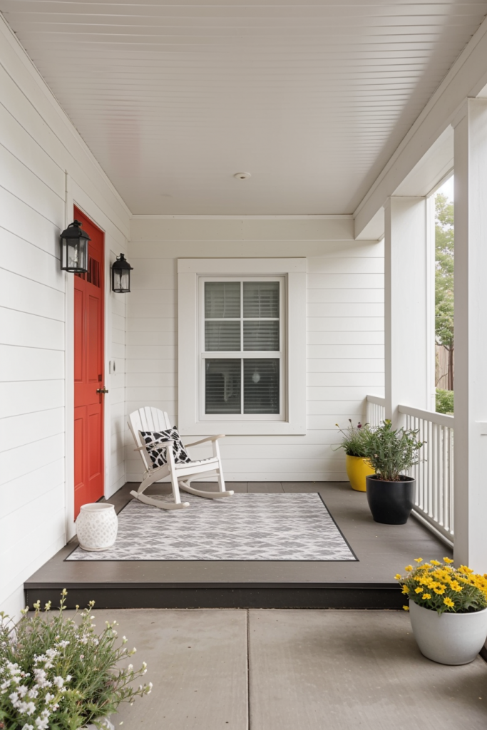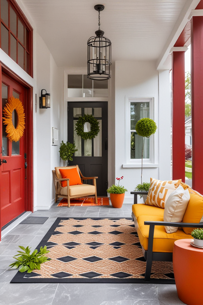 Decorating with vivid colors can change your porch from a simple entryway to a stylish outdoor space. Try using bright colors such as red and white, black and white, or olive and white with yellow or lavender accents. A combination of many different colors guarantees a balanced and pleasant atmosphere which reflects modern design.