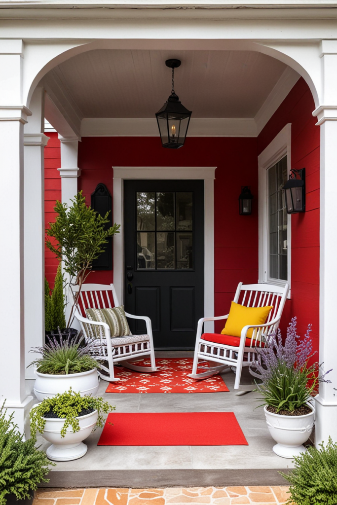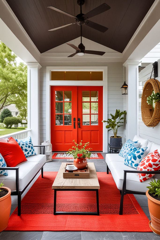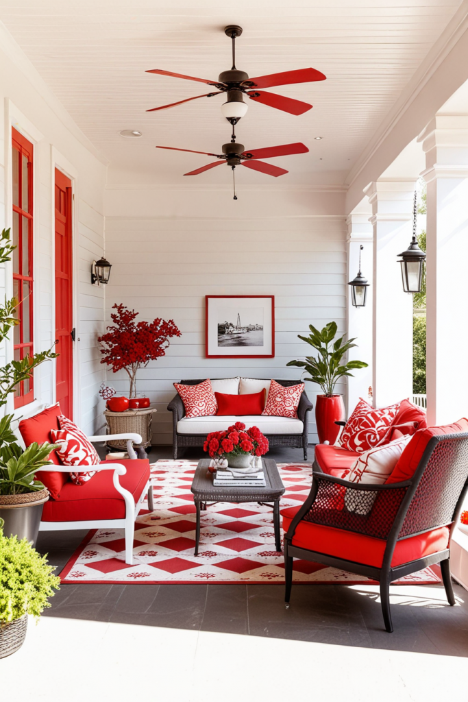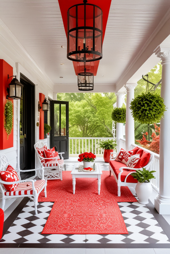 With red and white decorations, the space will look lively and energetic while also maintaining elegance. In this case, the relationship between the two colors is used in both ways to create a stunning visual which will surely leave an impression on anyone. The combination is appealing and can easily be balanced with modern accents to make the porch truly captivating.