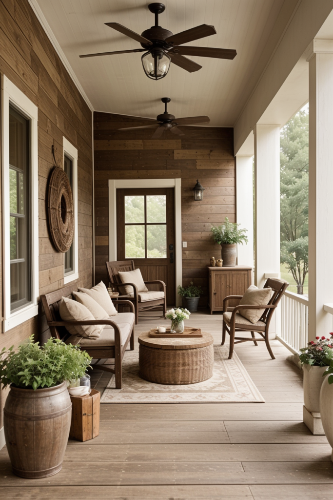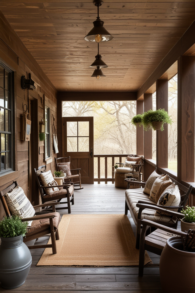 Rustic charm is paired with modern elegance as nature and vintage accents create an inviting ambiance for the porch. Focusing on the comforting allure, this decor style incorporates chocolate accents and blended weathered finishes. Other notes comprise the use of soft textiles combined with reclaimed wood to achieve the cozy yet sophisticated look.