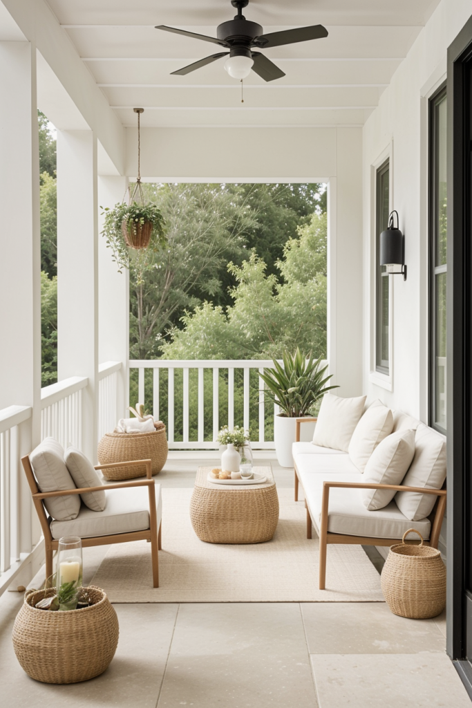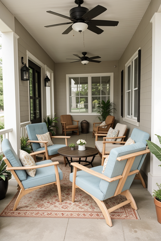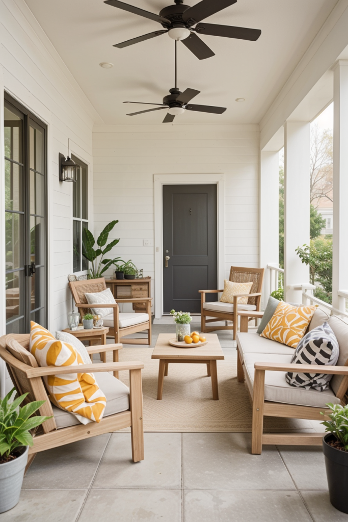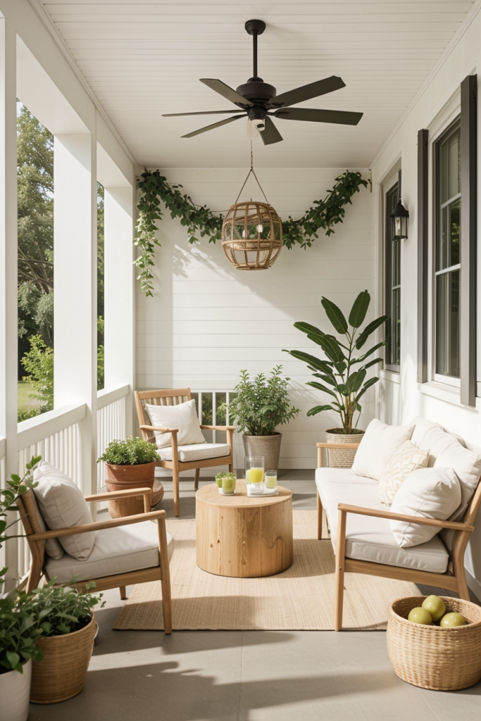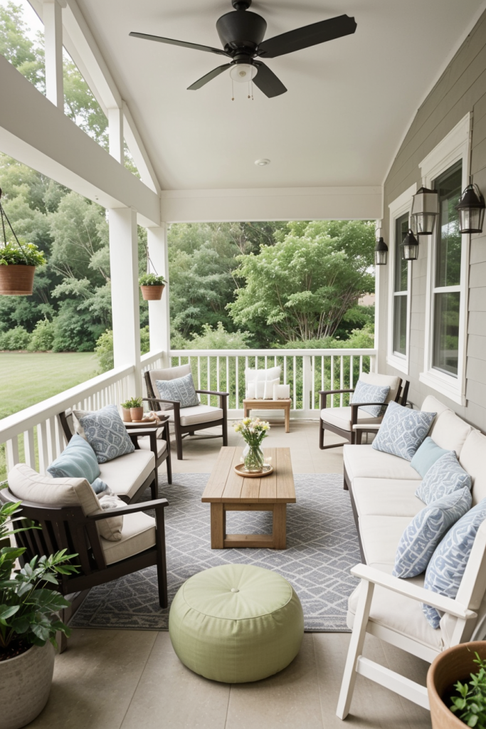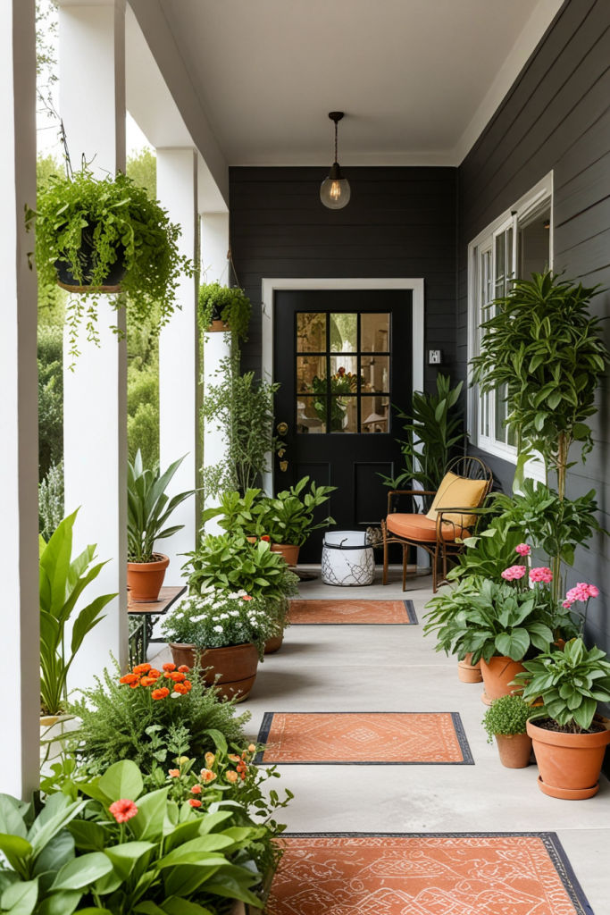 Having potted plants and flowers in the porch area of the house is essential to evoke a fresh, natural porch ambiance. Potted plants and flowers, in addition to adding beauty, also cleanse the air awaering people’s sweating. Blend different plant dimensions and varieties to achieve a multifaceted appearance and ensure an inviting environment all year round.