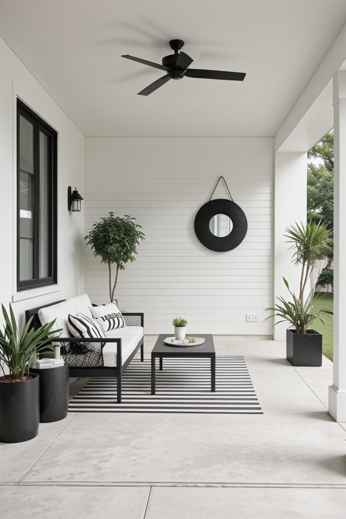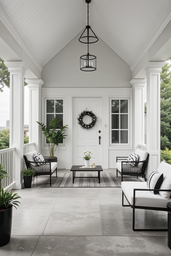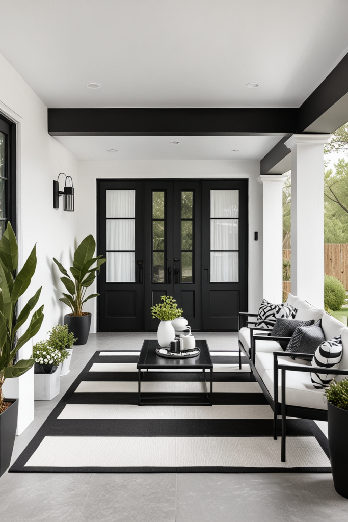Let go of the frills and enjoy modern decor with black and white colors that transform your porch setting into an elegant and simple appealing nook. This design incorporates the use of minimal furniture showcasing architectural features of the space, sharp contrasts, and clean boundaries. The mix of black and white colors provides flexibility with room to add additional decoration details if need be.