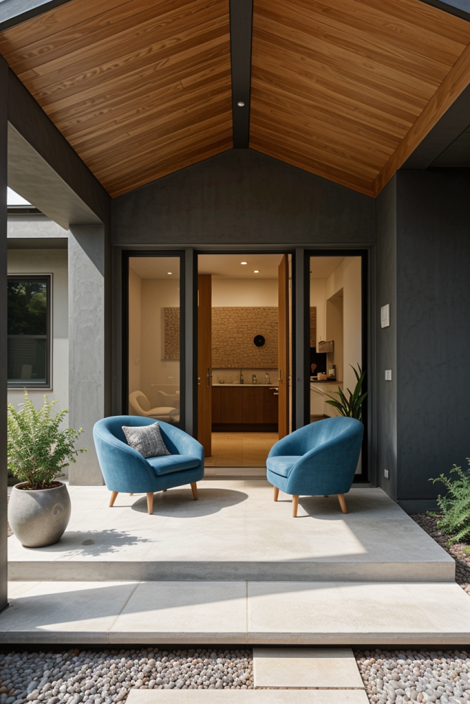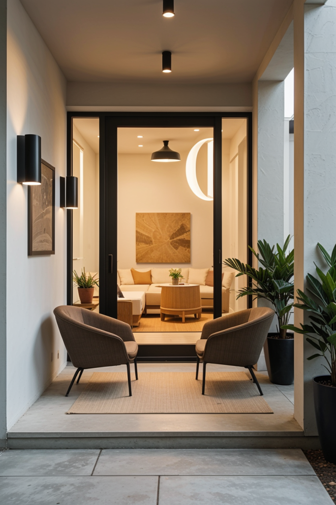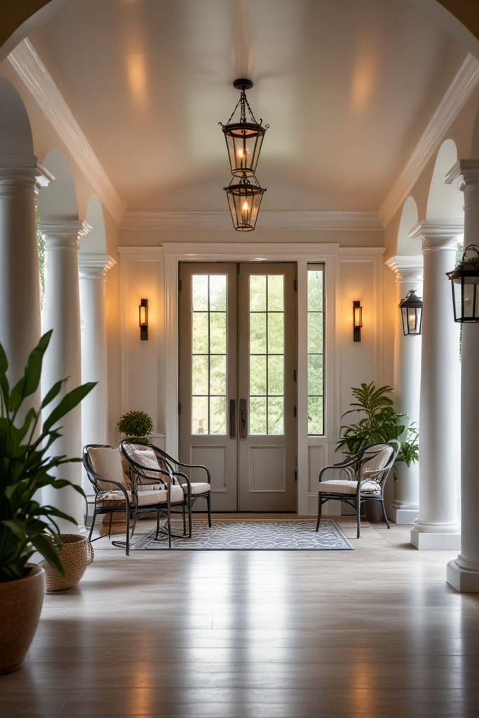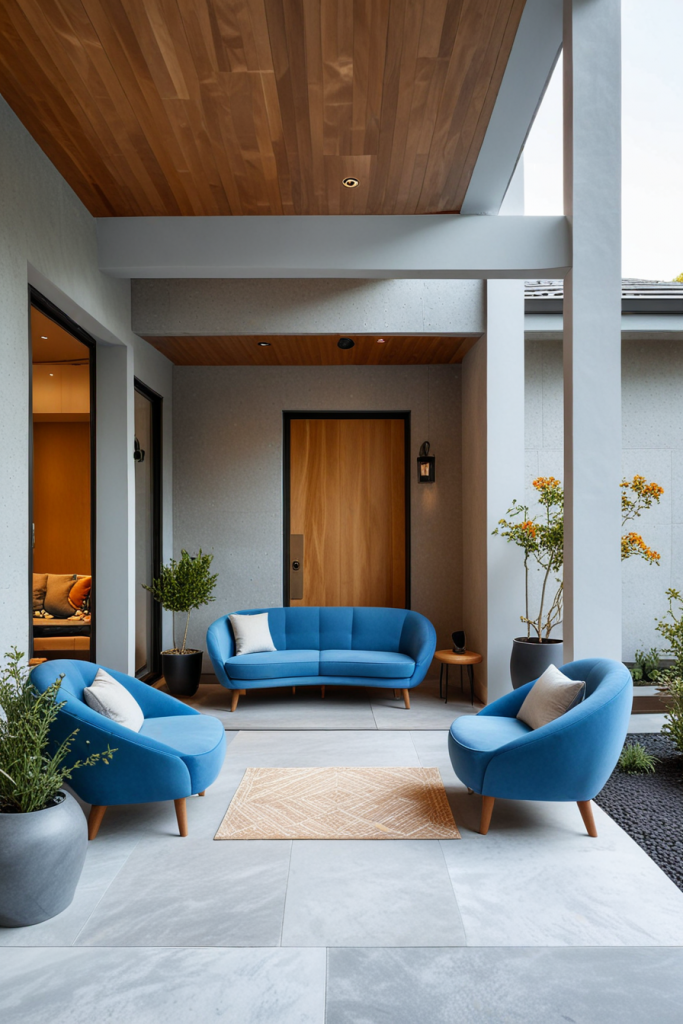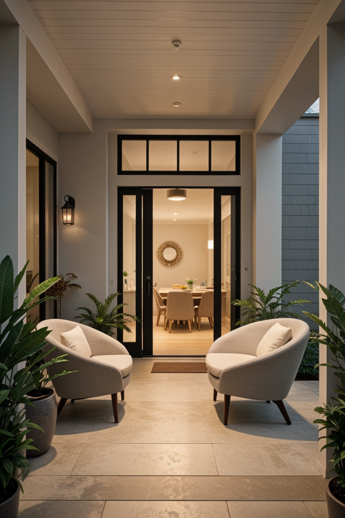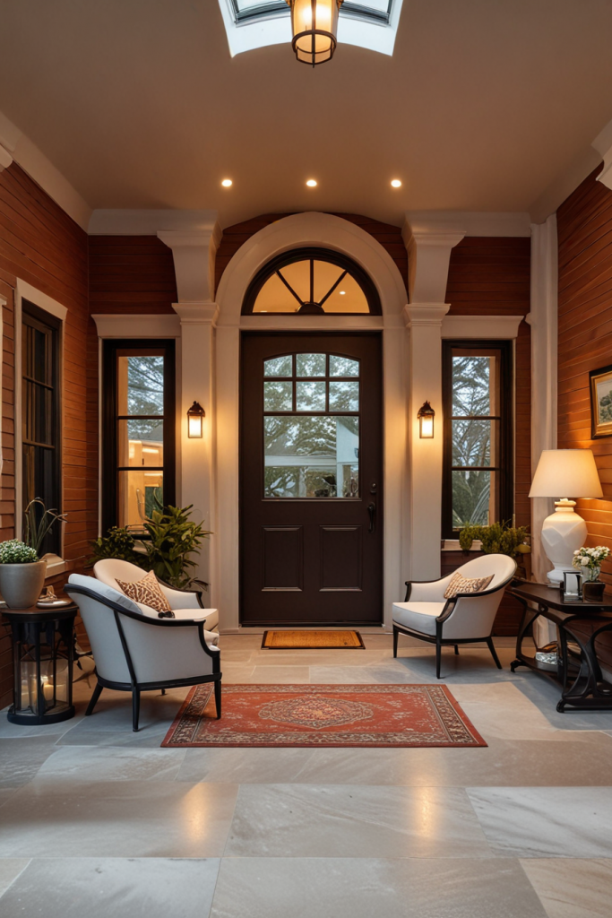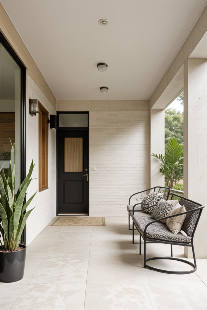 With the addition of curved interior features, this design concept adds fluidity and grazes the elegance of the interior porch space. Incorporative features like flowing architecture with chair curves at the door adds sophistication while improving ambience. Briefly stated, combining geometric details with the intended curves will create an appealing look.
