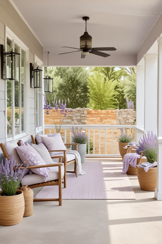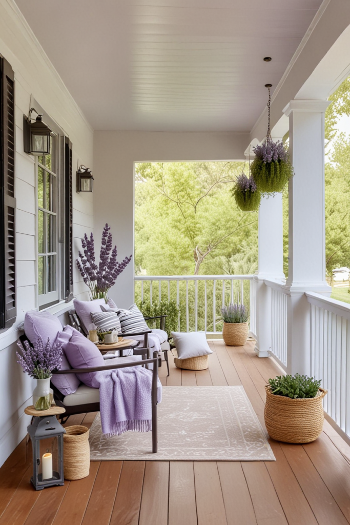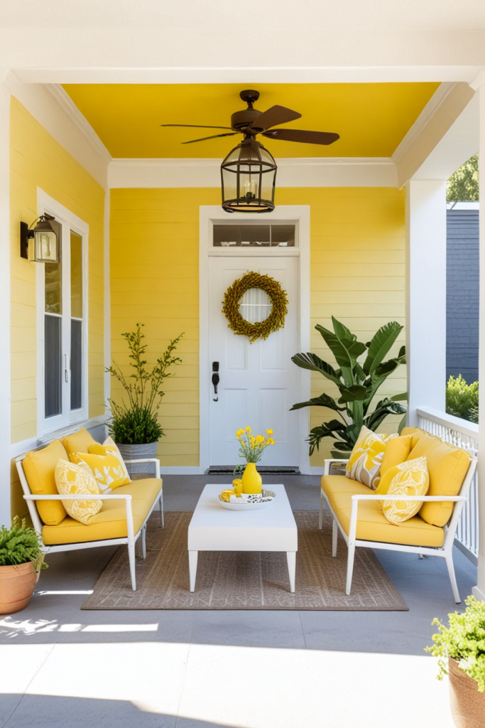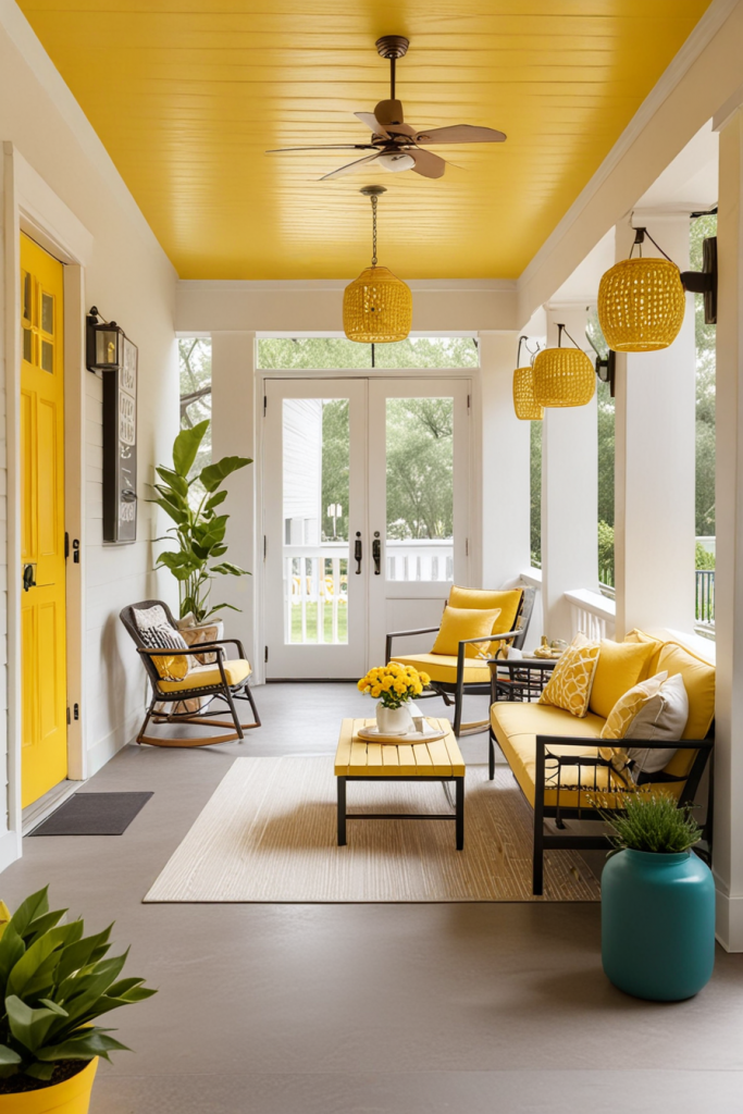 Adding vibrant and lively yellow accents adds warmth and life to your porch. This splash of color not only brightens the area but also contrasts beautifully with neutral shades, making the area welcoming and fun. To achieve the best results, use yellow decor in moderation to ensure it matches with lavender, red, and white decor.