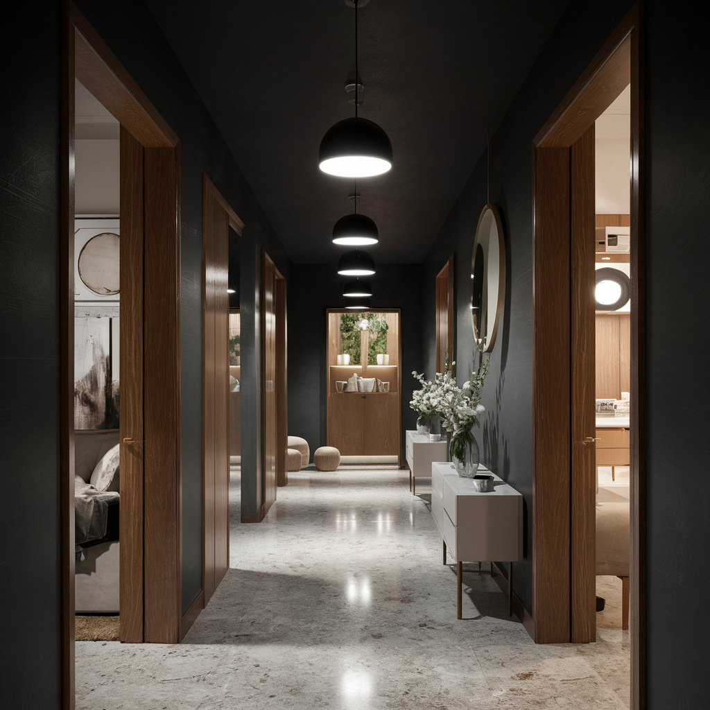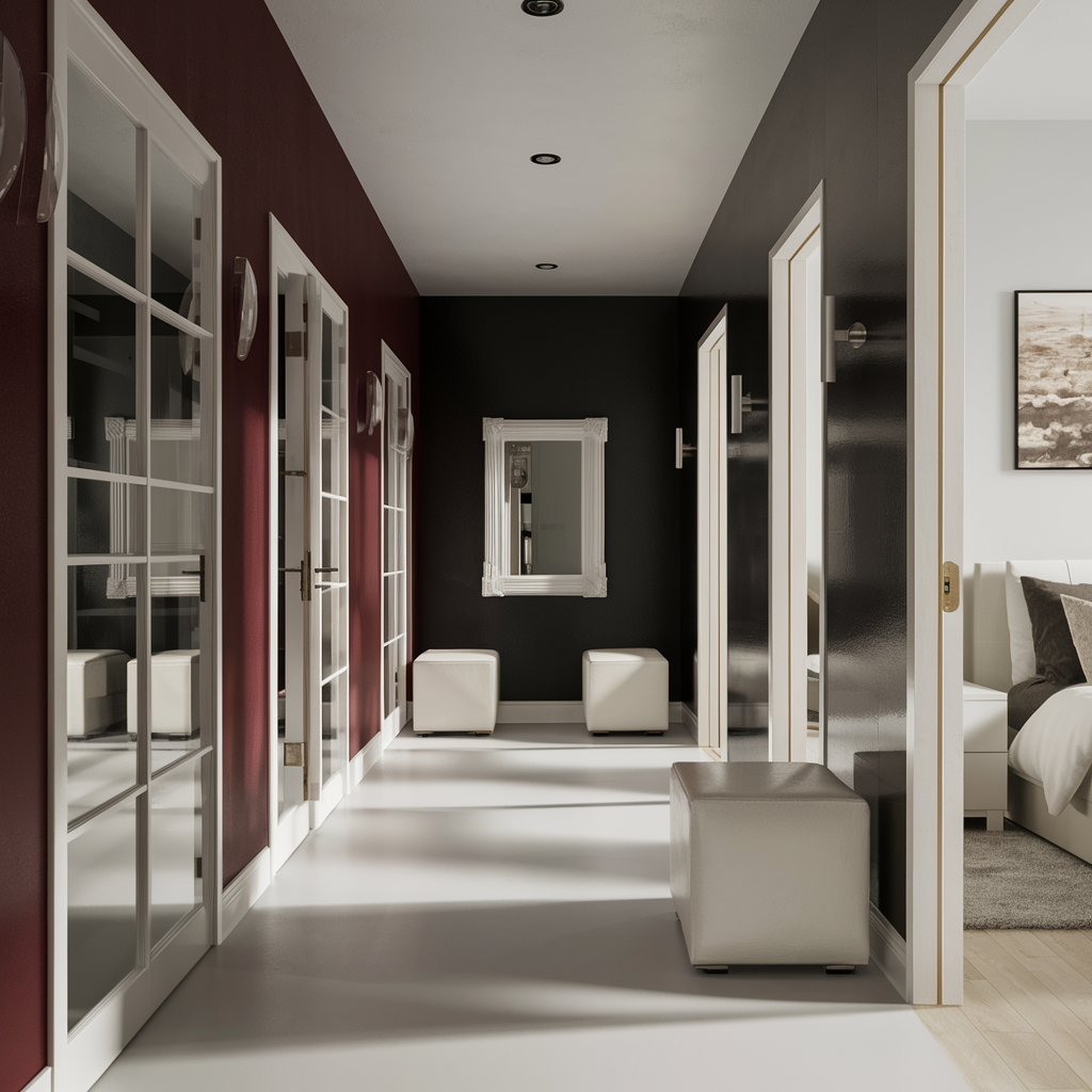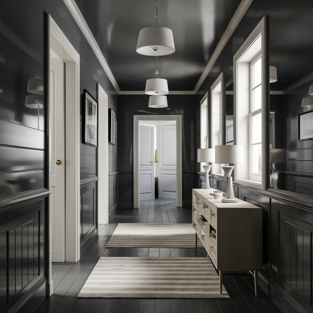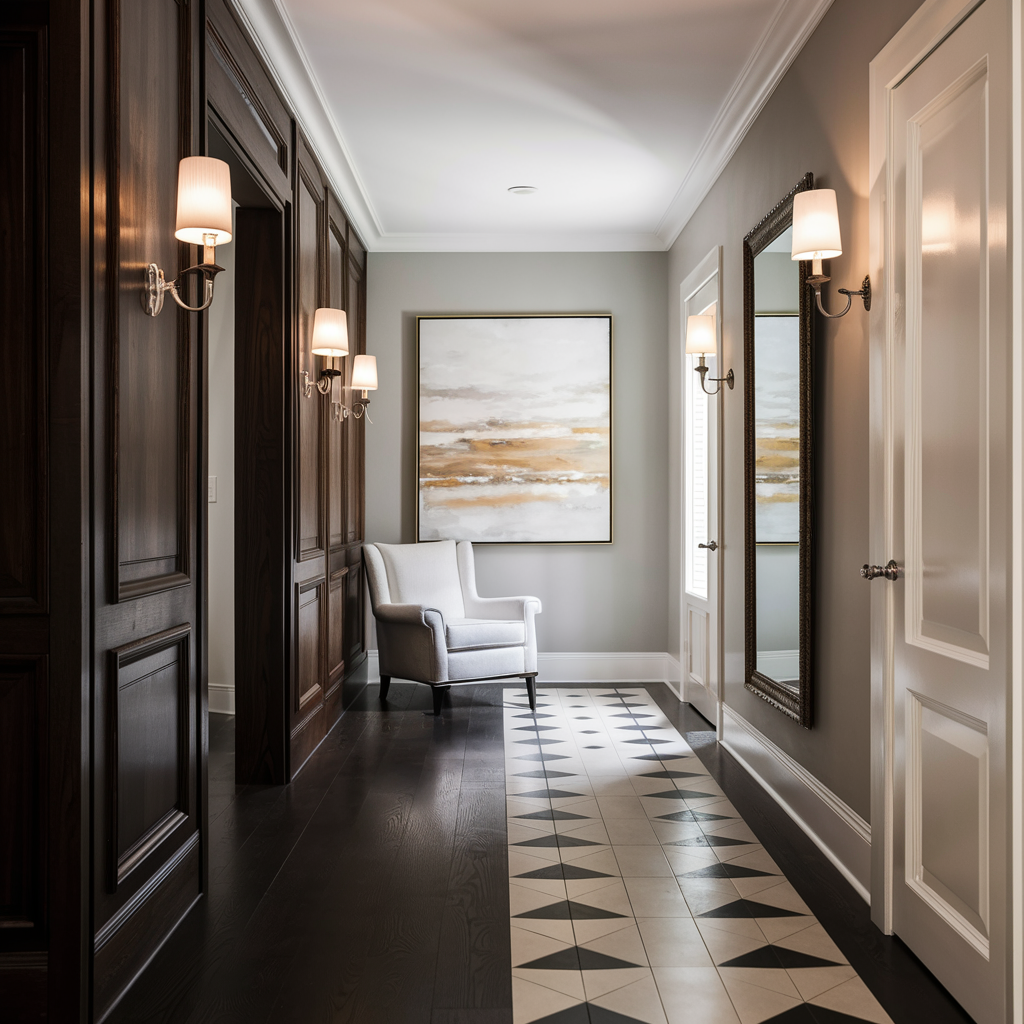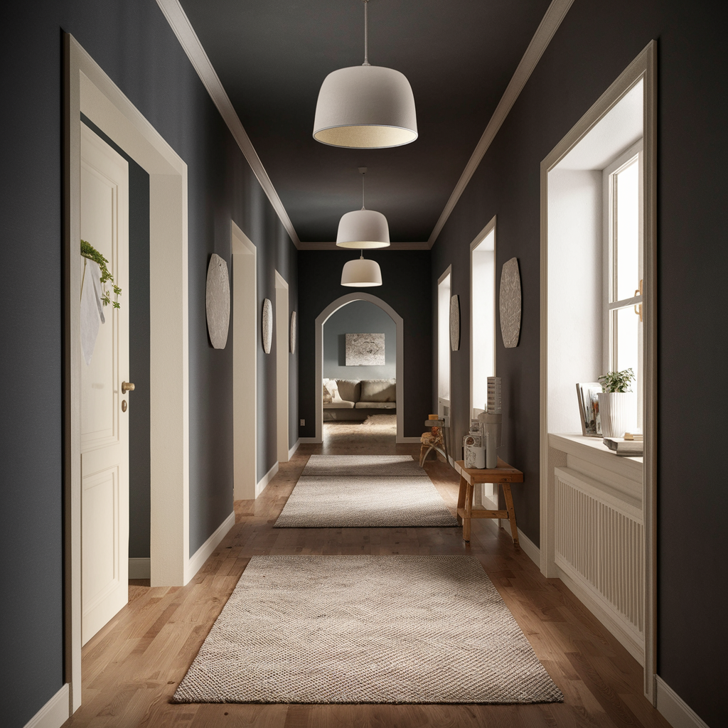 The right choice of paint colors multitasks from restoring a monotonous and gloomy to a bright and engaging space. Light, neutral colors such as whites, light grays, and soft pastels are excellent choices to reflect light and make the space feel larger and more inviting. For example, right wall colors like light to brighten up the hallway and also it is recommended to use the two-pane finish of gloss substrate for the walls or semi-gloss to be more enhanced and reflective.