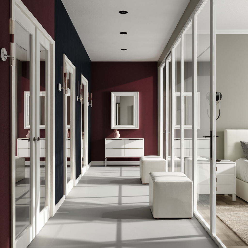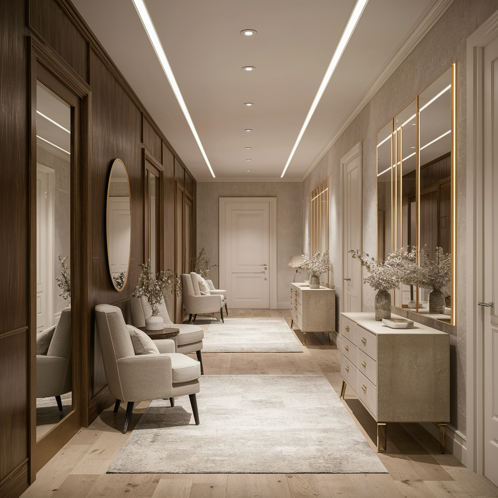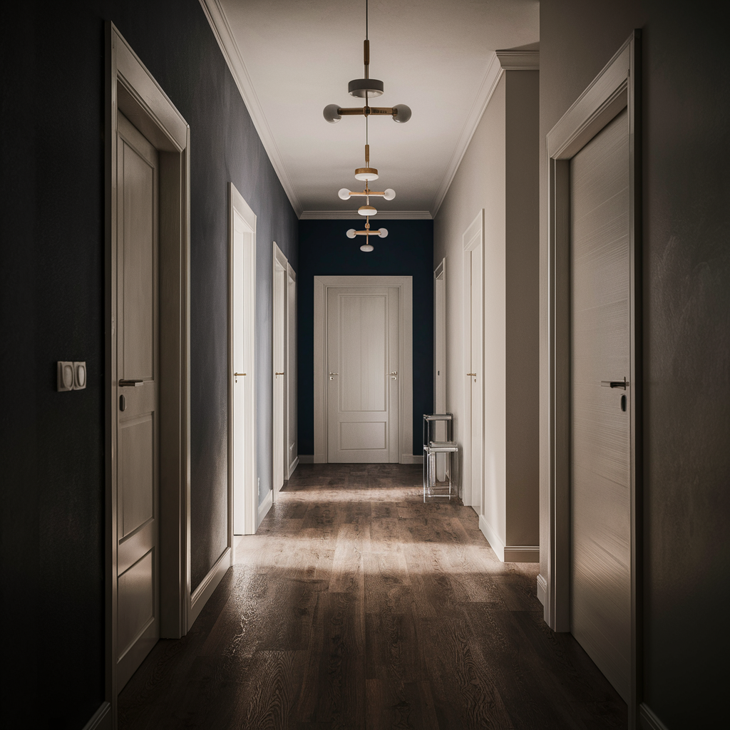 Creating a color scheme for dark hallways requires thoughtful selection of hues that can reflect light and enhance the space’s brightness. Maybe you can use different tones of soft colors such as different types of white or beige using mono-colored scheme technique. In another way, you can include light neutral tones with soft pastel issues to provide a little bit of creativity and at the same time, the hallways will remain wide and light.