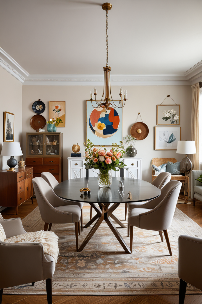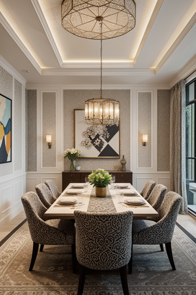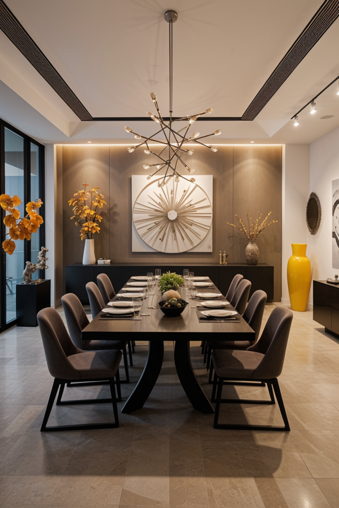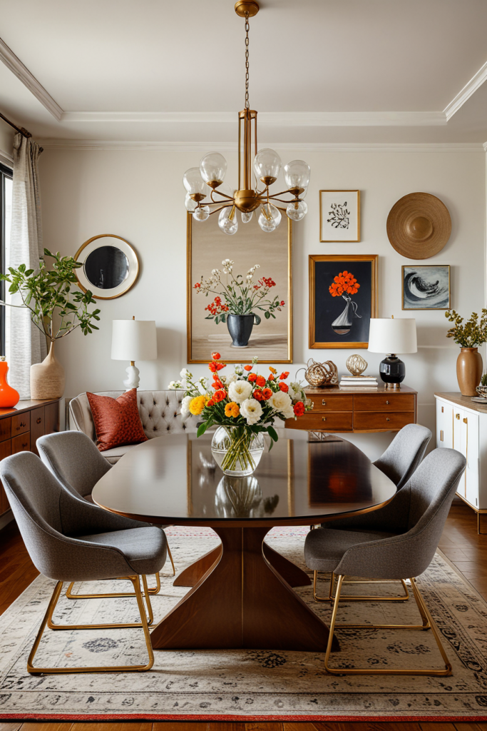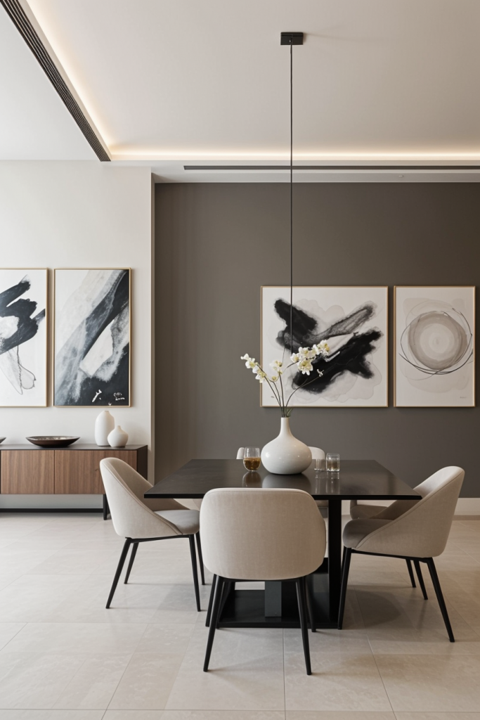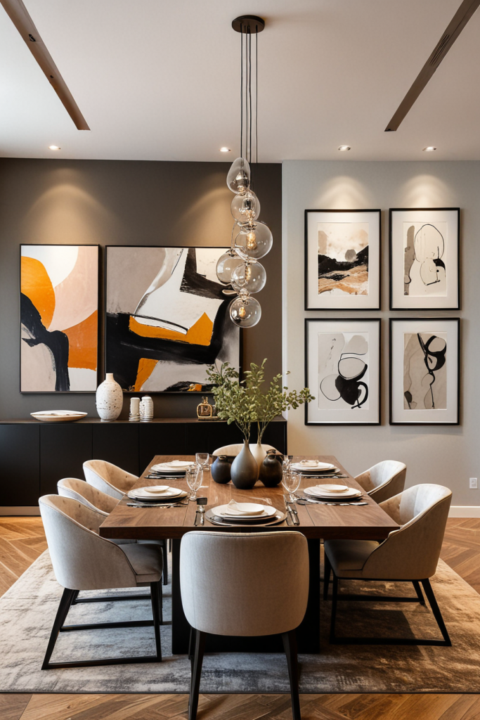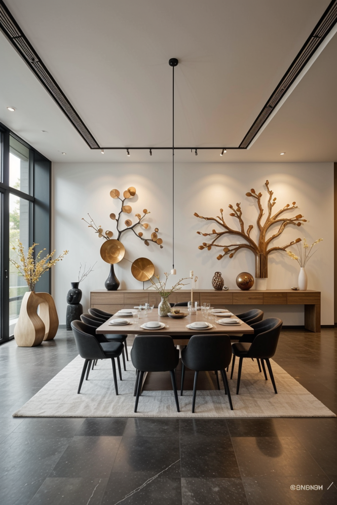 With the right modern wall arts and accents, your dining space can easily transform into a modern art gallery. In this design, abstract pieces, statement decor and bold prints not only serve as focal points but also provide the room with unique character and creativity. The combination of the carefully selected artwork and the decor accessories serves the purpose of achieving a set aesthetic with a dash of personality to the space.