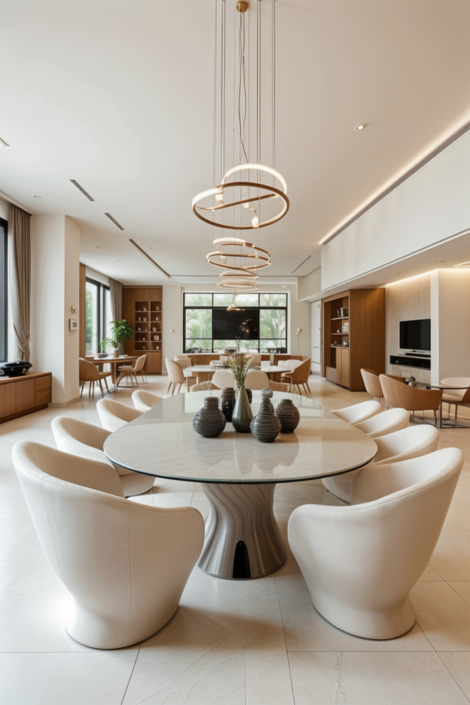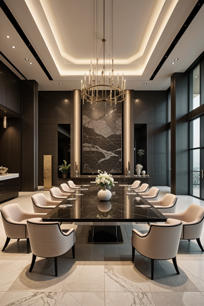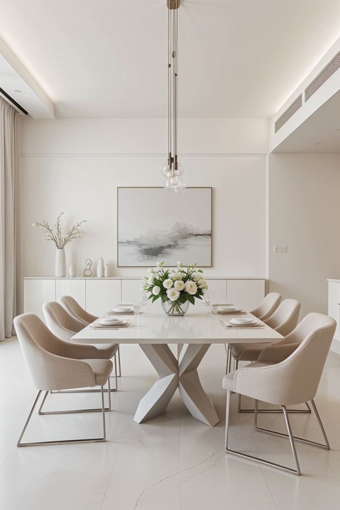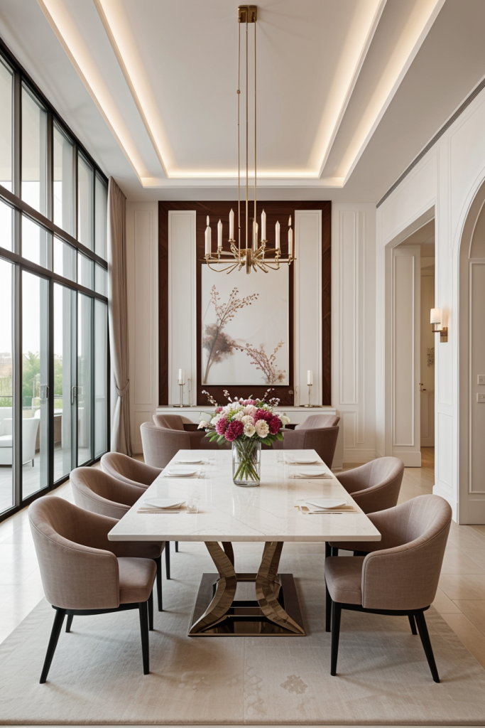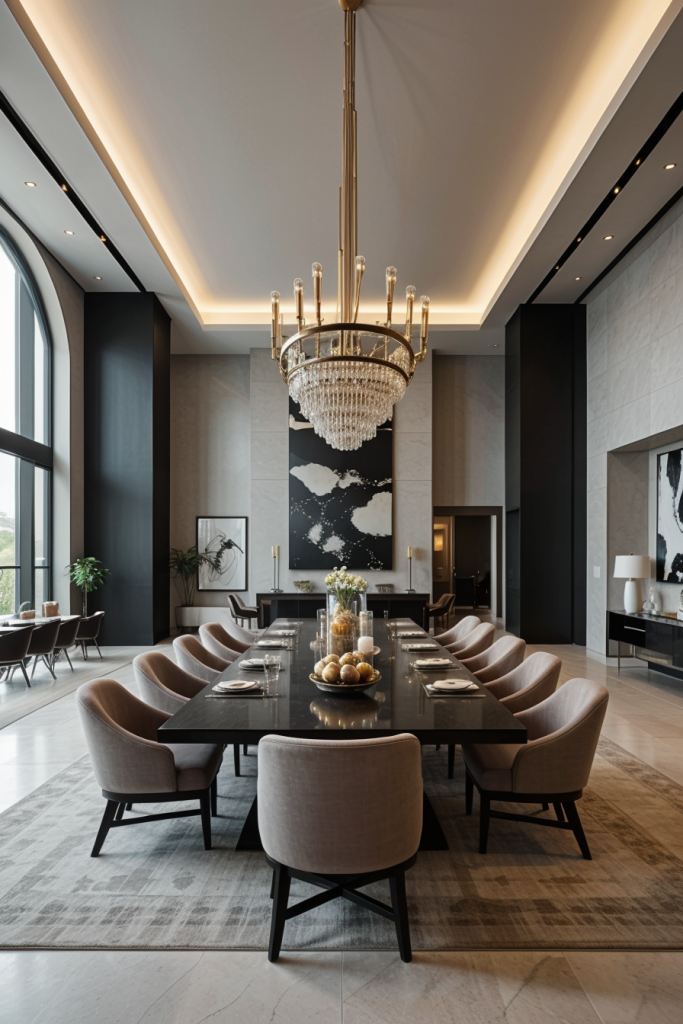 This vision underlines high-end art, designer clothes, and custom-made furniture, which seamlessly transitions the dining space into a gallery of contemporary elegance. Attention is given to every detail, from the chairs to the table settings, creating a space which tells a story of splendid and intentional design.