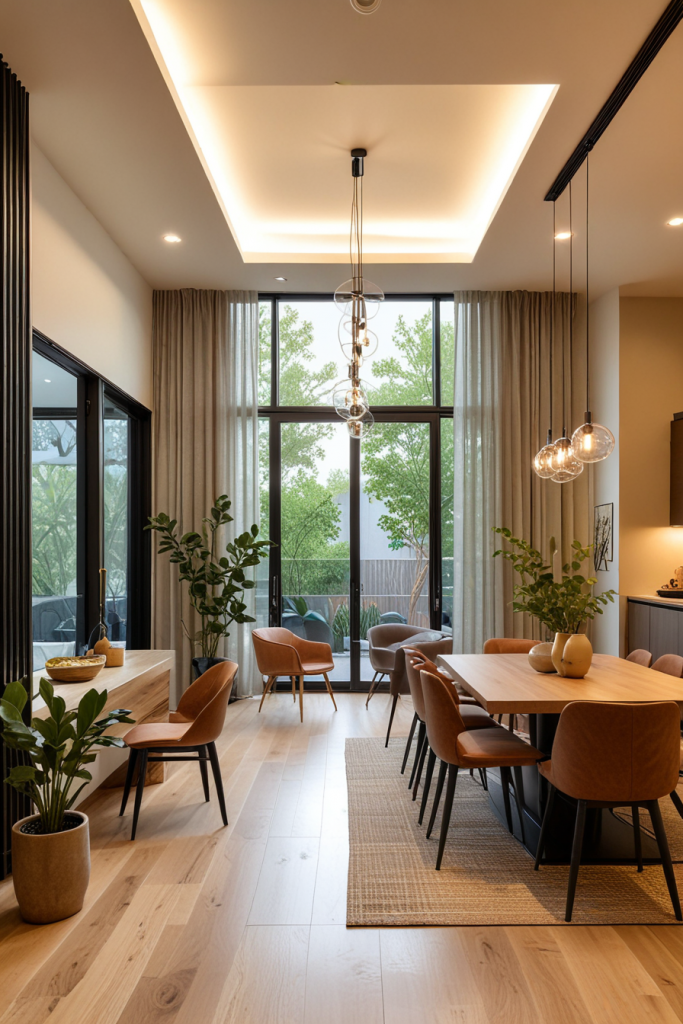 Enjoy the generous space offered by modern open-plan dining areas which seamlessly combine with living areas. This design encourages sunlight to flood into different spaces through the unobstructed layouts, floor-to-ceiling windows, and flexible furniture arrangements. Aside from boosting efficiency, the open concept also enhances the connection with nature by incorporating more windows.