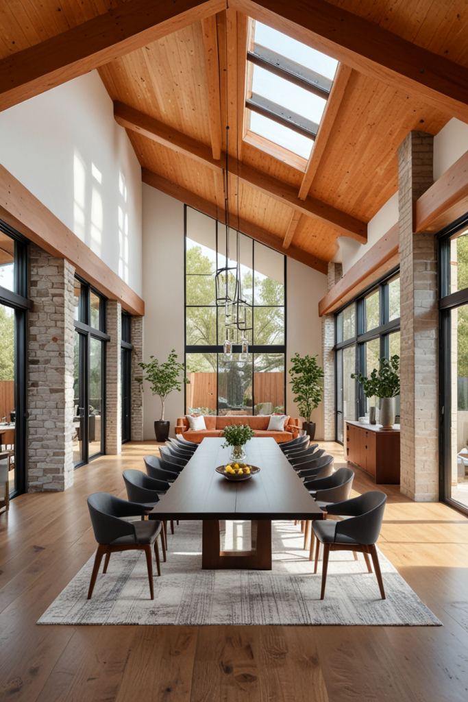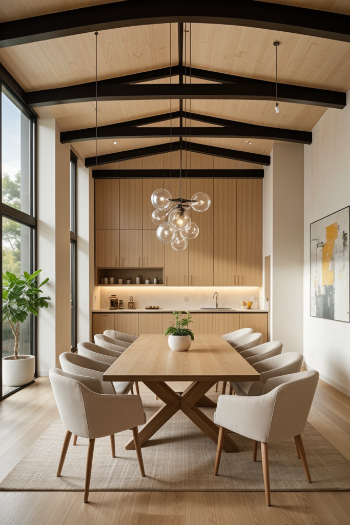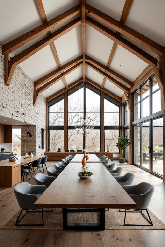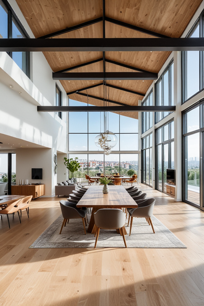 Incorporate architectural styles into your dining room designs for an elegant contemporary look. This idea strategically capitalizes on structural features, including open spaces, large windows, and open beams, which bridge the gap between design and architecture. The dining room becomes strong, stylish, and modern all at once.