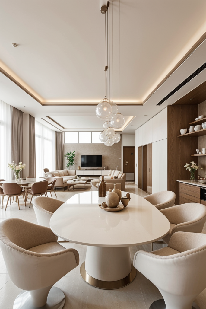 It merges the beauty of high-end design with the simplicity of minimalist, giving us a perfect, uncluttered, and chic dining space. An overall clean polish combined with premium materials and meticulous decor brings a warm aesthetic to the space while keeping it sophisticated.