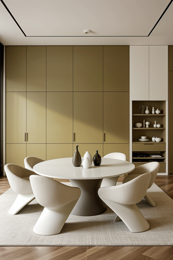 Organize your dining area with clean-cut storage options that perfectly blend functionality with modern design. Optimized for decluttering, this approach involves the use of hidden compartments, minimalist cabinetry, and modern shelving that serve dual purposes as functional pieces and design statements. The effortless combination of storage makes the space more functional without compromising the modern appearance of the room.