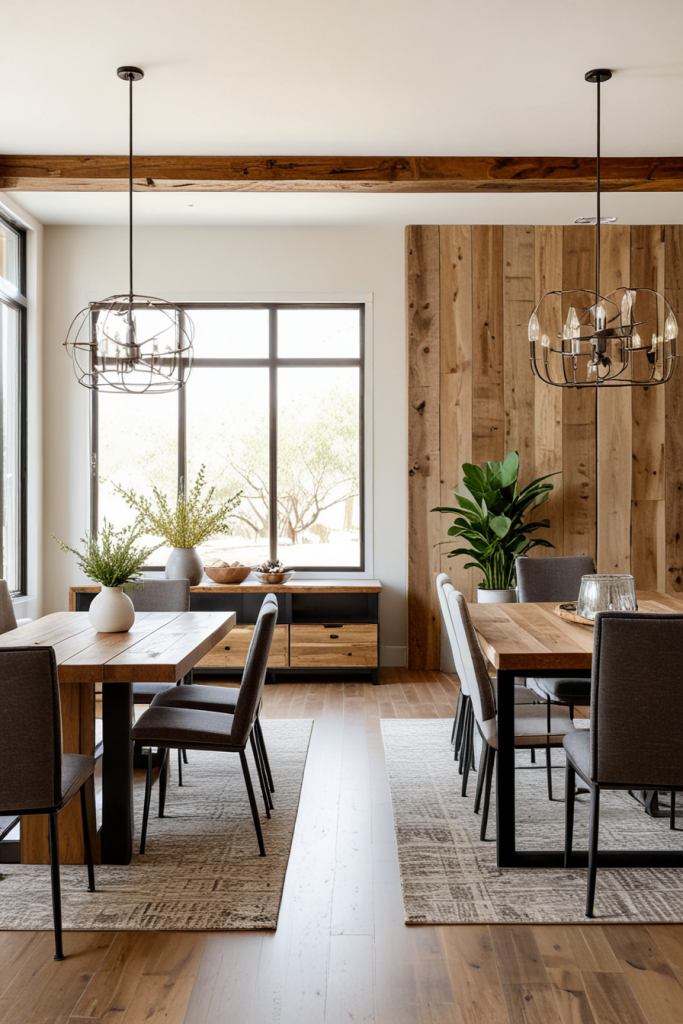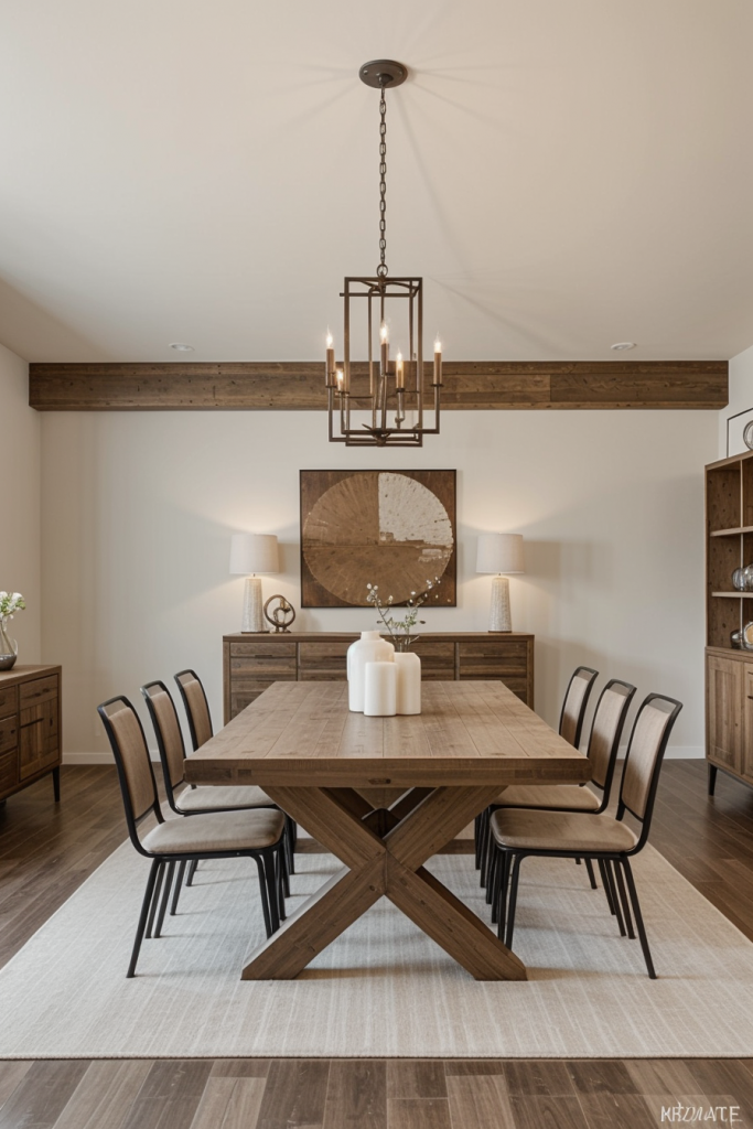 Explore the appeal of modern rustic elegance which uses natural textures and contemporary beauty to build a warm yet sophisticated dining area. This style combines reclaimed wooden furniture, industrial metal decor, and colorless modern shapes to achieve maximum comfort and elegance. The balance between rustic and modern charm is captivating and welcoming.
