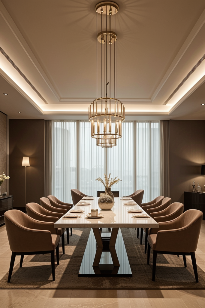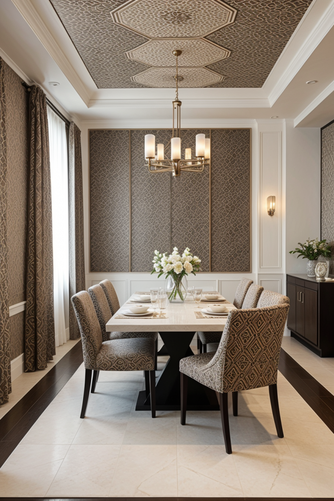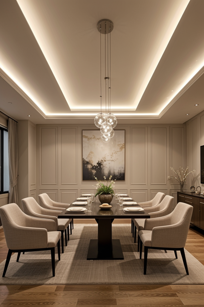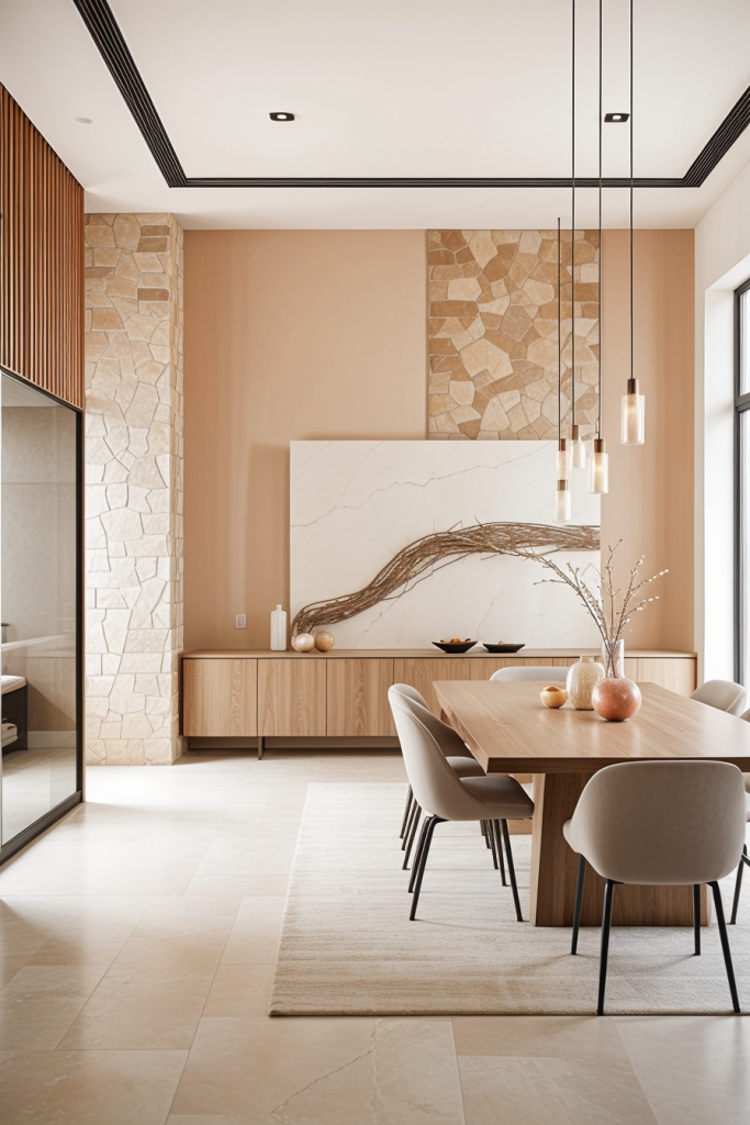 A perfect and sophisticated dining room will set the mood and tone for a wonderful dining experience which can easily transform into an elegant encounter. This design utilizes the soft illumination of colors along with textured regions to produce a warm and inviting atmosphere. The interplay of light and shadow creates balance while addign to the room’s charm, and modern appeal.